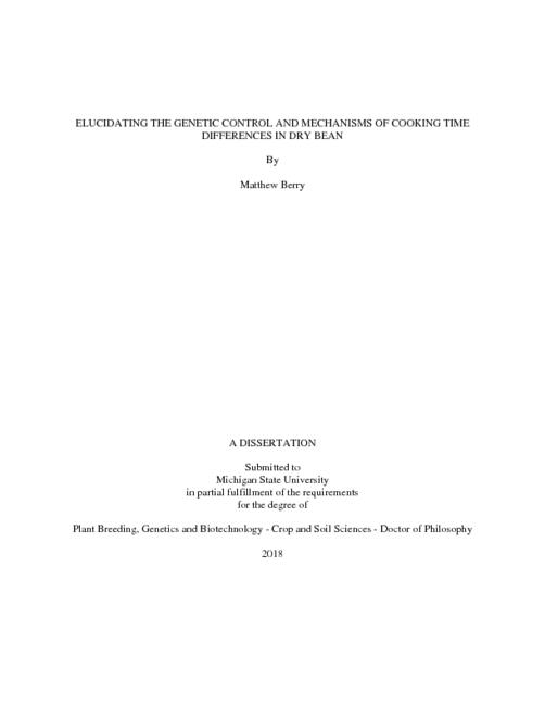 Dry bean (Phaseolus vulgaris L.) is a nutritious crop that is high in protein, fiber, vitamins and minerals and provides a large portion of dietary protein in the human diet. Beans require significant time to cook making them inconvenient for consumers potentially reducing the consumption rate. Considerable genetic variability exists for cooking time in P. vulgaris, but the underlying genetic causes of cooking time differences are largely unknown. To elucidate the genetic control of cooking time in dry bean, two Andean bean genotypes (TZ-27 and TZ-37) from Tanzania were identified with contrasting cooking times but similar seed color and plant growth habit. The average cooking time was 72.3 min and 33.1 min for TZ-27 and TZ-37, respectively, across nine growing locations globally. Additionally, TZ-37 had a 100 dry seed weight 1.2 to 1.5 times greater than TZ-27 in all test environments. The concentration of Ca and Mn were 1.7 and 1.3 times higher in TZ-27 than in TZ-37 respectively, while TZ-37 had 1.1 times the level of phytate than TZ-27.TZ-27 and TZ-37 were used to develop a biparental recombinant inbred line population (RIL) of 161 genotypes. The RIL population was evaluated for cooking time, hydration capacity, seed coat percentage, protein concentration, and other agronomic traits in Arusha and Morogoro in Tanzania in 2016 and 2017. Morogoro typically has higher temperatures, lower altitude, and lower soil fertility soil than Arusha. Significant variation was found for cooking time within the RIL population with a range of 21.4 min to 134.6 min across both years and locations. An environmental influence on cooking time was observed with the average cooking time in Morogoro being 15 min longer than Arusha. Five lines were identified that cooked faster than TZ-37 showing transgressive segregation for cooking time. Seed weight, hydration capacity, and protein concentration were inversely correlated with cooking time, while seed coat percentage was directly correlated.A quantitative trait loci (QTL) analysis was conducted using 2,427 single nucleotide polymorphism (SNP) markers discovered through genotyping by sequencing. Ten QTL were discovered for cooking time. A previously reported QTL, CT1.1, was found in Arusha in 2016 and 2017. CT3.2 was found in Arusha and Morogoro in 2017 and explained 20.5% of variation for the trait. CT6.1 was identified in both locations in 2017 and co-localized with multiple traits including hydration capacity, protein concentration, and 100 seed weight. CT10.1 was identified in Morogoro in both years. These 4 QTL, collectively, resulted in a reduction of cooking time by 16 minutes. Genes of interest within the cooking time QTL included one for polygalacturonase and another for the inhibitor of pectin methylesterase, which have previously been shown to affect cooking time. The QTL described serve as potential targets for improvement of cooking time in commercial dry bean genotypes and could be used to increase the efficiency in a breeding program by selecting for genotypes with multiple QTL for fast cooking. Developing faster cooking varieties would eliminate a major barrier for consumption. Faster cooking beans would be especially helpful in developing countries by reducing fuel burned as well as time required to gather firewood, which allows more time for other tasks.