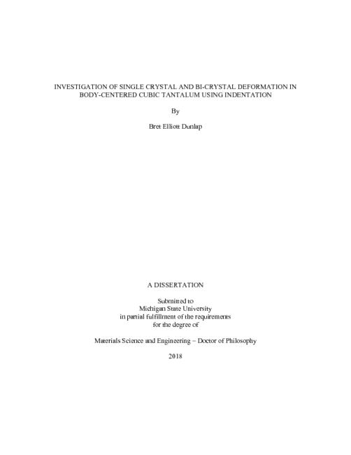 To understand how polycrystalline tantalum (Ta) deforms and develops damage that can lead to fracture, it is necessary to have an understanding of the single crystal deformation as well as deformation at grain boundaries. Metallic crystals generally deform from the motion of dislocations on crystallographic planes and this motion is dependent on the orientation of the individual crystals in relation to the imposed deformation. In order to study the effects that crystal orientation and grain boundaries have on deformation, as well as quantify and characterize the dislocations involved, three primary experiments were carried out. The first set of experiments involved single crystal microindentation, single crystal nanoindentation, and bi-crystal nanoindentation. The topographies developed were mapped using confocal microscopy for microindentations and atomic force microscopy (AFM) for nanoindentations. The single crystal indents revealed the effect crystal orientation has on topography and the bi-crystal nanoindentations reveal the effect that grain boundaries have on topography. In this work, three grain boundaries were targeted for analysis, with one indent made on each side of the grain boundary. Analysis shows that deformation across the grain boundary is dependent on the side from which deformation is approaching. The single crystal and bi-crystal nanoindentations were coupled with crystal plasticity finite element modeling (CPFEM) simulations in order to compare the experiments with predictive models. The second set of experiments characterized and quantified the dislocations involved in the underlying plastic deformation of single crystal and bi-crystal nanoindentations using electron channeling contrast imaging (ECCI) and cross-correlation electron backscattered diffraction (CC-EBSD). ECCI directly images and characterizes dislocations using contrast analysis. On the other hand, CC-EBSD calculates the geometrically necessary dislocation (GND) density from the subtle shifts in the EBSD patterns. CC-EBSD can also split the GND density onto the specific slip systems. The effectiveness of these two techniques to quantify and characterize dislocations were compared and the advantages and disadvantages of both outlined. In the third experiment, the sub-surface deformation of a single crystal wedge indentation was analyzed using ECCI and EBSD. The wedge indentation was specifically aligned to the crystal orientation so that when the sample was cut in half, all deformation was manifested as plane-strain in the analyzed surface plane. ECCI and EBSD were carried out on a small area underneath the area where the indenter tip was in contact with the sample. Backscattered electron (BSE) imaging and EBSD mapping reveal thin needle like bands that resemble that of twinning. The crystal orientation alternates between thin bands of rotated crystal orientation and thick bands of the original crystal orientation. ECCI shows high dislocation densities within the bands and at the boundaries between bands. Due to the fact that the alternating banding leaves no residual lattice curvature, it is concluded that all dislocations within a given band are statistically stored dislocations (SSDs). This work reveals that the surface topography and the dislocation distributions that result from indentation reflect the symmetry of the indented crystal orientation. Also, deformation at grain boundaries is dependent on the direction from which deformation is approaching. Even further, this work shows that the combination of indentation, AFM, ECCI, and CC-EBSD is a great method for investigating deformation but the limitations of each of these tools need to be understood in order to be fully utilized