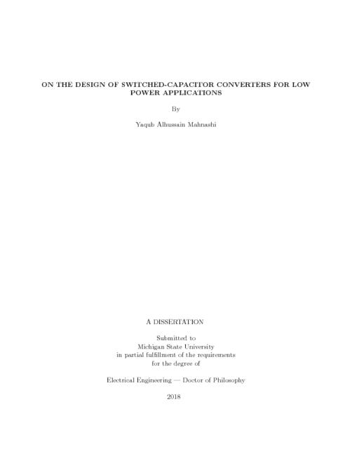 Power conversion is crucial to most electronic systems due to different voltage levels requirement within the system. Switched-capacitor converters are a subset of switching modeconverters, where the energy is transferred from the input to the output using only capacitors and switches. SC converters provide compact solution due to its magnetic-less structure,which makes them ideal to fulfill the high density requirement in low power applications. Inliterature, Dickson SC converter is considered a good candidate for low power applicationscompared to other SC topologies. Yet, Fibonacci SC (FSC) topology can be competitivedue to their minimum area requirement and relatively good efficiency performance. In addition, FSC provides the highest voltage-conversion-ratio (VCR) using the least number ofcomponents, and hence can be useful in high gain applications. Therefore, the main goal ofthis dissertation is to introduce FSC as a viable solution for low power applications. Thisdissertation contributes in three domains: (1) SC theory, (2) FSC synthesis and (3) FSCdesign and implementation.For the first part, the well-known SC fundamental limit theory, proposed in 1995 by MarkS. Makowski et al, is revisited. This theory sets the VCR boundaries for a specific numberof k flying capacitors in a SC converter. Although this limit is valid for the positive VCR,we found that another condition must be satisfied for the negative VCR. As a result, wepropose a generalized version of the theory to overcome these limitations, which establishesthe foundation for the rest of the work in this dissertation. Second part of the dissertationexplores the FSC synthesis problem. In fact, synthesizing nonlinear SC converters like FSCto achieve certain/multiple VCR is not trivial, and usually performed using ad-hoc approach.Therefore, an efficient algorithm to address the SC synthesis problem is proposed, which ismade available as an open-source tool, called FSC Synthesizer, to promote the use of FSC.The proposed tool is verified by implementing FSC converter that achieves four VCRs.Finally, the design procedure and analysis of a variable FSC converter is investigatedin both, discrete and on-chip implementation. For the first part, discrete FSC design isstudied, and a prototype for a variable FSC is built and tested. The PCB occupies an area of2.7inch2, which includes the controller and FSC. The adaptive VCR technique is employed toregulate the output voltage. For 300-600mV input voltage, the proposed converter provides amean output voltage of almost 1.46V with a 2:67% discrepancy from 1.5V nominal designedvoltage. For the second part, the on-chip integration challenges including parasitic chargeloss and start-up from low voltage, are studied. A charge recycling technique exploiting thepresence of parasitic capacitors in each other phase of FSC converter has been employedresulting in 27% reduction in the power loss, which improves the overall efficiency by 12:7%.For a proof-of-concept, a monolithic FSC is implemented in 0:5μm CMOS technology on4mm2 die area. The post-layout simulation is carried out using Virtuoso ADE. With 0.3Vinput voltage, the system achieves 47:5% peak power efficiency with 5μW load