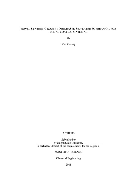 Bio-based materials synthesized from sustainable and renewable resources are gaining considerable attention in academe and industry. Soybean oil is a bio renewable molecule suitable for conversion to useful materials. It possesses unsaturated (double bond) structure in its molecular chain, and can be modified or reacted with other reactive chemical species to produce value added biobased materials.Coating materials prepared from the reaction of soybean oil and reactive silanes (vinyl trimethoxy silane and vinyl terminated polydimethylsiloxane) are described in this thesis. The silylation reaction occurs at high temperature and pressure in the presence of peroxide as catalyst. The silane molecule was grafted onto soybean oil backbone and on curing with water gave coating materials with water resistant property. Biobased products containing different molar ratios of soybean oil and silane were synthesized and characterized. The silylated soybean oil was coated on the substances and the coating performances evaluated. These coating materials were evaluated for biodegradability and showed that they were biodegradable under aqueous conditions. Biodegradability of these coating materials was also measured to demonstrate that these materials were biodegradable These coating materials are recommended as protective coatings for water sensitive substances, such as wood, paper and starch foams.