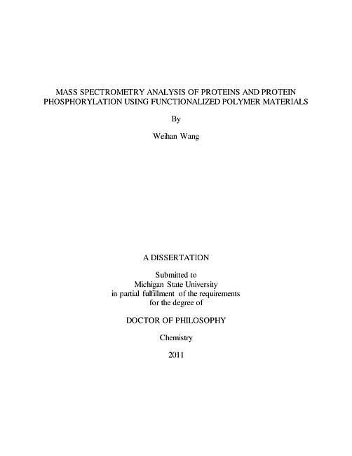 Posttranslational protein phosphorylation helps control many cellular processes, so identification of stimuli-induced phosphorylation events is vital to understanding cell regulation. Characterization of phosphorylated proteins by mass spectrometry (MS) typically employs small phosphopeptides (<3000 Da) generated by complete protein digestion. However, efficient phosphopeptide ionization for MS and tandem MS (MS/MS) analysis requires enrichment of phosphopeptides from complex protein digests. Alternatively, digestion of proteins to larger peptides (middle-down proteolysis) can improve protein sequence coverage in MS analysis and reveal a wider range of phosphorylation sites than complete digestion. Initially, this dissertation reviews recent studies on phosphopeptide enrichment and middle-down proteolysis. Based on these studies, the research aims to (1) improve enrichment of small phosphopeptides for MS analysis of target phosphoproteins, and (2) generate large tryptic peptides for middle-down proteomics. In studies on enrichment, polymer brushes derivatized with nitrilotriacetate-Fe(III) complexes (NTA-Fe) or oxotitanium (oxoTi) capture phosphopeptides from protein digests. Specifically, polymer microspots derivatized with NTA-Fe and surrounded by hydrophobic poly(dimethylsiloxane) facilitate pre-concentration and enrichment of dilute phosphopeptides from only 1 μL of digest. Matrix-assisted laser desorption/ionization (MALDI)-MS directly on the 250-μm spots leads to a sub-fmol detection limit for a β-casein phosphopeptide. Compared to films derivatized with NTA-Fe, polymer-oxoTi brushes improve the capture and detection of mono-phosphopeptides in mixtures of model protein digests. Moreover, MALDI collision-induced dissociation (CID)-MS/MS on polymer-oxoTi identified unknown phosphopeptides from several p65-associated phosphoproteins. These phosphoproteins immunoprecipitated together with p65 from the nuclear extracts of human acute monocytic leukemia cells. Bifunctionalization of polymer brushes with both oxoTi and NTA-Fe groups leads to simultaneous low-bias enrichment of mono- and multi-phosphorylated peptides from moderately complex model protein digests. For larger samples (tens of μLs), stacking two membranes modified with polymer-oxoTi and polymer-NTA brushes, respectively, in an HPLC fitting enhances phosphopeptide enrichment. The two membranes sequentially capture mono- and multi-phosphorylated peptides from 3 phosphoprotein digests (~1 μg total mass) in the presence of ~70 μg of non-phosphoprotein digest. To control digestion for middle-down MS analysis of proteins, pumping protein solutions through nylon membranes containing immobilized trypsin affords digestion times ranging from a few milliseconds to seconds. In modified membranes with 0.45 μm pores, a 50-ms digestion of apomyoglobin leads to peptides with MWs primarily between 2.5 and 6 kDa. Five of these peptides cover the entire protein sequence. A 10-ms β-casein residence time in modified membranes with 1.2-μm pores yields peptides with masses primarily between 3 and 20 kDa. Two large peptides constitute the entire protein sequence, and one of them covers all the five phosphorylation sites. These simple enrichment methods and new digestion techniques for middle-down proteomics should facilitate future studies of protein phosphorylation.