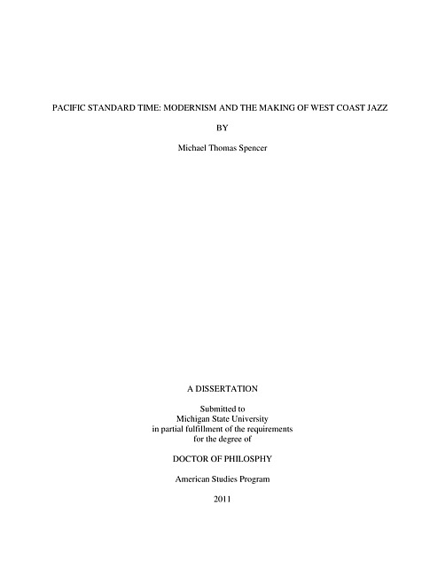 An interdisciplinary study of one of the most overlooked and understudied movements in the history of jazz, this dissertation draws from the fields of New Jazz Studies, Popular Culture Studies, and Art History in order to reconstruct the cultural history of West Coast jazz. Focusing on the critical texts and institutions that allowed this movement to germinate and expand, I explore the ways in which the music was represented through various types of media: on record, on radio, on screen, in concert, and in print (i.e., record labels, radio stations, jazz periodicals, etc.). As a result, this study recontextualizes the West Coast jazz movement within the milieu of California modernism around the middle 20th century as a way to observe the broader jazz community; one which included musicians as well as photographers, painters, architects, sculptors, filmmakers, and other modernists.