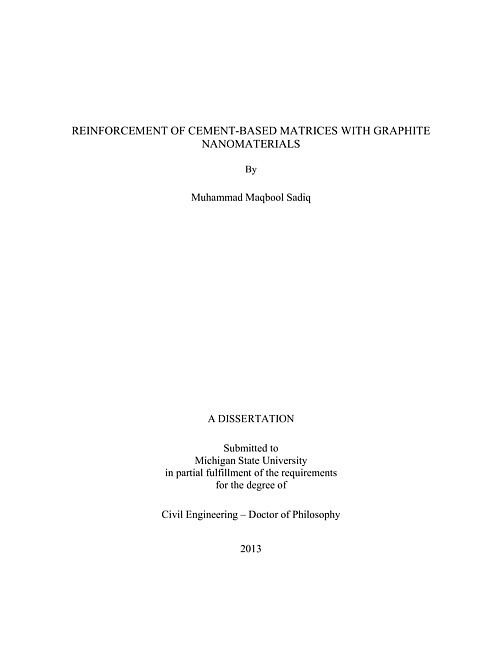 Cement-based materials offer a desirable balance of compressive strength, moisture resistance, durability, economy and energy-efficiency; their tensile strength, fracture energy and durability in aggressive environments, however, could benefit from further improvements. An option for realizing some of these improvements involves introduction of discrete fibers into concrete. When compared with today's micro-scale (steel, polypropylene, glass, etc.) fibers, graphite nanomaterials (carbon nanotube, nanofiber and graphite nanoplatelet) offer superior geometric, mechanical and physical characteristics. Graphite nanomaterials would realize their reinforcement potential as far as they are thoroughly dispersed within cement-based matrices, and effectively bond to cement hydrates. The research reported herein developed non-covalent and covalent surface modification techniques to improve the dispersion and interfacial interactions of graphite nanomaterials in cement-based matrices with a dense and well graded micro-structure. The most successful approach involved polymer wrapping of nanomaterials for increasing the density of hydrophilic groups on the nanomaterial surface without causing any damage to the their structure. The nanomaterials were characterized using various spectrometry techniques, and SEM (Scanning Electron Microscopy). The graphite nanomaterials were dispersed via selected sonication procedures in the mixing water of the cement-based matrix; conventional mixing and sample preparation techniques were then employed to prepare the cement-based nanocomposite samples, which were subjected to steam curing. Comprehensive engineering and durability characteristics of cement-based nanocomposites were determined and their chemical composition, microstructure and failure mechanisms were also assessed through various spectrometry, thermogravimetry, electron microscopy and elemental analyses.Both functionalized and non-functionalized nanomaterials as well as different micro-scale fibers were used for comparison purposes at different volume fractions. Replicated mixes and tests were considered to provide the basis for statistically reliable inferences. Theoretical studies were conducted in order to develop insight into the reinforcement mechanisms of properly functionalized graphite nanomaterials. The results suggested that modified graphite nanomaterials improve the mechanical performance of cement-based matrices primarily through control of microcrack size and propagation, relying on their close spacing within matrix and dissipation of substantial energy by debonding and frictional pullout over their enormous surface areas. The gains in barrier qualities of cement-based materials with introduction of modified graphite nanomaterials could be attributed to the increased tortuosity of diffusion paths in the presence of closely spaced nanomaterials.Experimental investigations were designed and implemented towards identification of the optimum (nano- and micro-scale) reinforcement systems for high-performance concrete through RSA (Response Surface Analysis). A comprehensive experimental data base was developed on the mechanical, physical and durability characteristics as well as the structure and composition of high-performance cementitious nanocomposites reinforced with modified graphite nanomaterials and/ or different micro-fibers.