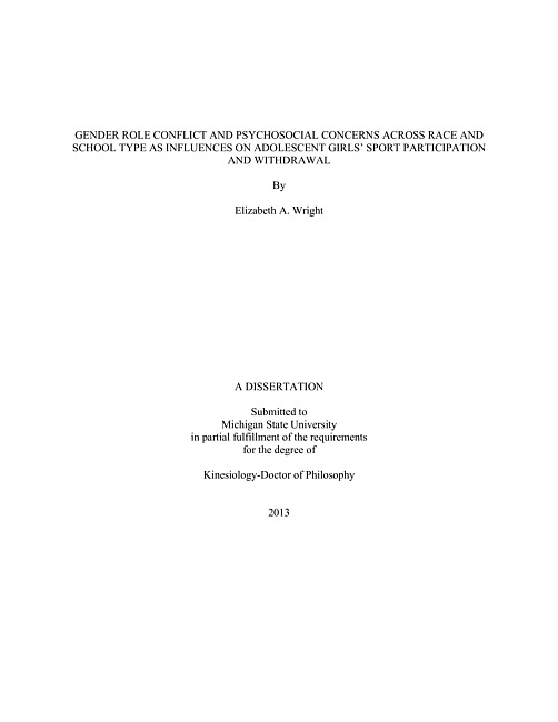 One of the most popular activities for both boys and girls to participate in are sports, with over 44 million youth involved in youth sports (National Council of Youth Sports, 2008). While girls are participating at higher rates than they were before the passage of Title IX in 1972, there still exists a discrepancy between the number of boys and girls who participate in sports. Further, there is an even larger discrepancy when looking at the demographics of the adolescent girls who are participating at the lowest (girls of color and girls from low-income urban areas) and highest (girls who are white and reside in suburban areas) rates.One way of studying these discrepancies in sport participation is examining if gender role conflict or psychosocial concerns have a significant impact on adolescent girls' sport participation. With there being a lack of research that studies the sport experiences of girls of various racial and economic backgrounds, this study filled this void by examining not only girls' gender role conflict and psychosocial concerns, but also their overall levels of sport participation and their views on gender appropriateness of sports.Two hundred and thirty-six girls who attended middle SES suburban (n = 130) and low SES urban (n = 106) high schools participated in this study. It was found that adolescent girls reported low amounts of gender role conflict and psychosocial concerns. Related, girls also reported that gender role conflict and psychosocial concerns played a small role in any decreased middle school sport participation. Some differences emerged when examining girls' experienceswith these two measures across race, with African American girls having significantly more concerns with their image and African American girls from middle SES suburban schools reporting the highest amount of impact of gender role conflict.There were similar mixed findings when examining current sport participation. Girls who were current athletes in high school actually had higher gender role conflict scores than those girls who were non-current sport participants. There were limited differences between current and non-current sport participants' psychosocial concerns, with non-current sport participants reporting significantly higher image concerns. Similar results were found with girls who had played and quit a feminine sport, as they had higher image concerns than girls who had played a quit a masculine sport. When looking at middle school and high school sport participation, white girls from middle SES suburban schools were typically the girls that participated the most in sport. What played an especially significant role was the type of school a girl attended, with African American girls particularly negatively impacted with their high school sport participation if they attended a low SES urban school.While more research is needed to confirm these patterns, what these findings suggest is that there is a significant decrease in sport participation between middle school and high school, but only for girls that attend low SES urban schools. Noting the small amount of impact that psychosocial concerns and gender role conflict had with girls in this study, it can be tentatively concluded that there are other reasons that impact adolescent girls' decreasing or quitting their sport participation.