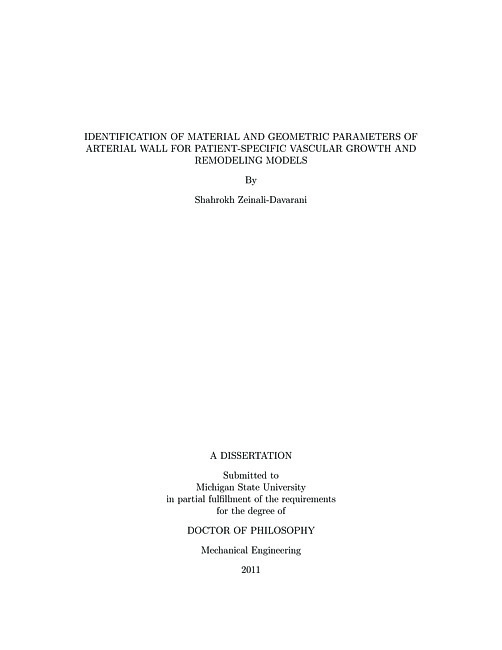 The uncertainty associated with an individual abdominal aortic aneurysm (AAA) rupture carries a considerable amount of health risks as well as social and economic burden. There is a need for advanced technologies to mitigate this burden by early detection, patient-specific risk assessment and clinical management. Computational vascular mechanics has been of great interest along with the recent advances in medical imaging, experimental techniqueand computational simulations. In particular, computational modeling of vascular growth and remodeling (G&R) has provided further understanding of the G&R process that occurs in vascular diseases. Despite rapid expansion of our knowledge of vascular G&R, developing patient-specific models of AAA evolution is still an open problem and subject to numerous challenges.In this study, a framework is presented where, first the identification of the intrinsic material and geometric parameters for patient-specific modeling is addressed and then a finite element model of AAA G&R that accounts for medical image-based geometrical models is introduced. With regard to the material parameters, estimation of parameters of a multifiber family model for passive arteries in the presence of the measurement noise is considered.First, the uncertainty propagation due to the errors in variables is carefully characterized using the constitutive model. Then, the parameter estimation of the artery model is formulated into nonlinear least squares optimization with an appropriately chosen weight from the uncertainty model. The proposed technique is evaluated using multiple sets of synthesized data with fictitious measurement noises. The results of the estimation are comparedwith those of the conventional nonlinear least squares optimization without a proper weight factor. The proposed method significantly improves the quality of parameter estimation as the amplitude of the errors in variables becomes larger. We also investigate model selection criteria to decide the optimal number of fiber families in the multi-fiber family model with respect to the experimental data. The effect of multiple models for mechanical behavior ofarteries is also investigated. Distribution of the geometric parameters, being wall thickness and fiber orientations, are estimated using a 2-D parameterization of the vessel wall surface and a global approximationscheme integrated within an inverse optimization routine. Two conditions determine the objective of the optimization. First, the fundamental assumption in adaptation models, namely the existence of vascular homeostasis in normal vessels, should be maintained in a vessel model built from medical images. Second, the deviation of vessel wall from the original/image geometry subject to the normal pressure should be minimized. The same inverse technique is used to investigate the consequence of different homeostasis assumptions on the optimized distribution of parameters. The numerical optimization method results in a considerable improvement in both satisfying homeostatic condition and minimizing the deviation of geometry from the original shape based on in-vivo images.Then, a finite element model of stress-mediated G&R of arteries based on medical image-based geometries is presented for simulation of AAAs. Degradation of elastin initiates a local dilatation of the aorta while stress-mediated turnover of collagen and smooth muscle compensates the loss of elastin. Stress distributions and expansion rates during the aneurysm growthare studied for multiple spatial distributions of elastin degradation and kinetic parameters of the growth. Temporal variations of the elastin degradation and kinetic parameters are also investigated with either direct time-dependent degradation or stretch-induced degradation as possible biochemical and biomechanical mechanisms for elastin degradation. The results show that this computational model has the capability to capture the complexities ofaneurysm progression due to variations of geometry, extent of damage, and stress-mediated turnover as an important step towards patient-specific modeling.