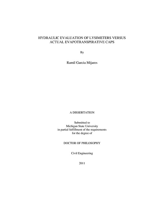 The ability to quantify percolation through a soil profile is one of the important considerations for geoenvironmental systems. Reliable estimates of percolation through natural soil deposits help in determining local groundwater recharge rates. For landfills, accurate measurement of percolation through the cap is necessary for permitting earthen final covers. Even though percolation is generally the smallest component among water balance parameters, quantifying its magnitude is environmentally critical and key in evaluating the overall hydraulic performance of final covers. Direct estimation of percolation through a soil cover is typically achieved using pan lysimeters which consist of a drainage layer underlain by an impermeable geomembrane liner. The presence of this hydraulic barrier in lysimeter, which is used to facilitate the collection and measurement of percolation, alters the hydraulics of the system. This dissertation aimed to evaluate the difference in hydraulic performance of a lysimeter versus actual earthen cap with underlying landfilled waste. Two uncompacted and one compacted field-scale earthen cap test sections were built and instrumented at a landfill near Detroit, Michigan to investigate the hydraulic difference between an actual cap (underlain by waste) and corresponding lysimeter which was used to directly measure percolation. Lysimeter pans were installed in the middle of each test sections and the instrumented area was expanded upslope and downslope of the lysimeter to monitor the soil water storages within and beyond the lysimeter footprint. About 35 sensors were installed in each of the test sections to monitor water contents, water potentials, soil temperatures, water levels, and gas pressures. The field results show soil water storage values for the uncompacted test sections that were underlain by waste were typically greater than those for the corresponding lysimeters. For the compacted test section, there was no significant difference between the soil water storage for the actual cap and the lysimeter. Using the single porosity numerical models UNSAT-H and Vadose/W, the field measured percolation in the lysimeter as well as the variation in soil water storages were predicted with an acceptable accuracy for the compacted test section. The presence of macropore flow through large clods in uncompacted test sections is not accounted for in these single porosity models. A numerical analysis showed that when a lysimeter underestimates the soil water storage of an actual earthen cap, it corresponds to greater actual percolation across the interface between the soil cover and the underlying waste. A lysimeter overestimates percolation because the infiltrated water drained into the lysimeter is immediately removed and is therefore not available for removal by evapotranspiration. Field-scale simulations also showed that the magnitude of capillary barrier effect introduced by the drainage layer in the lysimeters is negligible when the saturated hydraulic conductivity of the soil cover is equal to or less than 10^-5 cm/s.