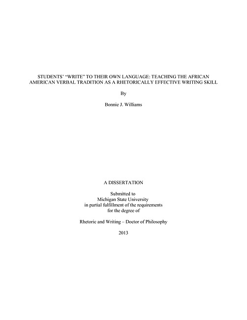 ABSTRACTSTUDENTS' "WRITE" TO THEIR OWN LANGUAGE: TEACHING THE AFRICAN AMERICAN VERBAL TRADITION AS A RHETORICALLY EFFECTIVE WRITING SKILLByBonnie J. WilliamsThe 1972 Conference on College Composition and Communication's (CCCC) resolution declaring "Students' Right to Their Own Language" (SRTOL) defends the rights of students and all other writers to use different varieties of English. In addition, the 1988 CCCC adoption of the National Language Policy (NLP), which responds to the "English-Only" Movement, boldly asserts that English-Only is educationally unsound. However progressive these policies may be, there still remains a request from teachers on how to identify and develop effective pedagogies that advance language diversity in the classroom. The present research study offers one solution by introducing a comparative approach to writing instruction that recognizes African and African American contributions to standardized American written communication structures. Using culturally relevant pedagogy and culturally sustaining pedagogy as theoretical frames, I explore the effects of a "comparative approach" to African American Language and Literacy instruction, which makes clear that African American Verbal Tradition (AVT) may be incorporated into expected conventions for academic writing. This research study takes place in two first-year writing courses at a major Midwestern university in which students are introduced to AVT. AVT is a broad linguistic tradition, therefore I have selected five features of AVT to investigate: repetition, signifyin[g] and indirection, call & response, narrativizing, and sounding. My project uses Critical Race Theory (CRT) and Critical Discourse Analysis (CDA) as analytical methods to help me make sense of my data from students' written work, my field notes on our classroom experiences, and my audio taped transcriptions of students' reflective discussions. CRT helped me describe and understand the effects race had on students' attitudes, behaviors, and perceptions when exposed to anti-racist pedagogy that challenges negative assumptions about people of color in relation to education. I perform a close textual analysis of select transcripts using CDA and to examined how dominance and hegemony were reproduced or resisted in the students' text (essays) and talk (student directed conversations).