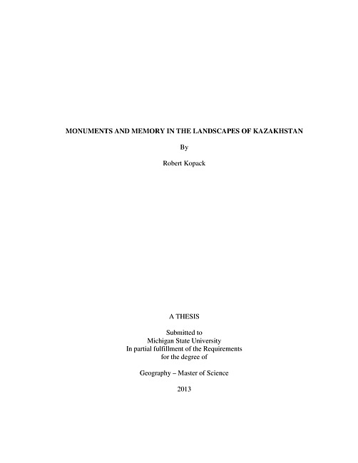 MONUMENTS AND MEMORY IN THE LANDSCAPES OF KAZAKHSTANBy Robert Kopack In the context of totalitarian regimes and their aftermaths, memorial landscapes are highly contested spaces in which newly emerging governments are quite active in framing and reframing the past as well as mapping a course for the future. Unsurprisingly, statuary and other overtly ideological materials are immediate targets. An abundance of scholarly literature has investigated memory, memorialization, and commemoration as state processes inherently complicated and problematized by greater public involvement. Far less time has been given however, to investigating the contrasting ways a state condemns or esteems the previous regime and for what reasons. Expanding these themes, Kazakhstan presents an ideal case study. Through an examination of archival materials, sixteen months of fieldwork, structured and unstructured interviews, media analysis, and governmental publications--this thesis uses discourse analysis to show the multiple agendas, conflicts, and negotiations that characterize the process of remembering the past and refashioning national identity in Kazakhstan. In this I examine three cities and how the legacies of the Soviet Union are selectively employed by the state to meet specific aims. First, underscoring a lack of uniformity in how the Soviet period is managed at the state level, this thesis investigates more broadly the kinds of currency that the Soviet period affords to Kazakhstan in different contexts. The three cities highlighted in this thesis were chosen to demonstrate the distinct ways that the legacies of the Soviet Union are employed in Kazakhstan in order to advance social, political, and economic agendas.
