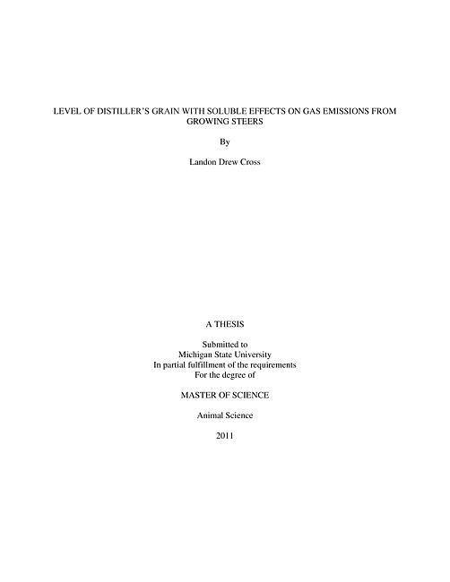 ABSTRACTLEVEL OF DISTILLER'S GRAIN WITH SOLUBLE EFFECTS ON GAS EMISSIONS FROM GROWING STEERSByLandon Drew Cross A rising concern with feeding high levels of distiller¡&hibar;s grain with soluble (DGS) is its high S and N content and the effects it might have on S- and N-containing emissions from gas produced in the rumen and manure. Two trials were conducted with 12 Holstein steers housed in individual environmentally-controlled rooms to monitor gas emissions. Three dietary treatments were fed in trial 1; containing 0% (control), 40%, and 60% DDGS. In trial 2, treatments were the same except the 60% DDGS dietary treatment was replaced with a 40% DDGS diet fortified with 8 ppm Mo and 90 ppm Cu, which will be referred to as 40% DDGS+. The 40% DDGS+ diet served as a potential strategy to mitigate S-containing gas emissions. Each trial was divided into 2 phases; phase 1 of each trial monitored emissions when urine and feces were collected in the same vessel. Phase 2 of each trial monitored emissions while steers were fitted with fecal bags to separate feces from urine. Distiller¡&hibar;s grain with soluble increased H2S and NH3 production (P < 0.05) and these emissions were decreased to undetectable levels during phase 2 of each trial compared to emissions generated in phase 1 (P < 0.01). Addition of Mo and Cu in trial 2 tended to decrease H2S emissions when adjusted for S-intake (P = 0.08). In trial 2, the 40% DDGS+ treatment decreased CO2 emissions (P ¡Ü 0.05) and tended to generate less CH4 emissions compared to the control and the traditional 40% DDGS diet.