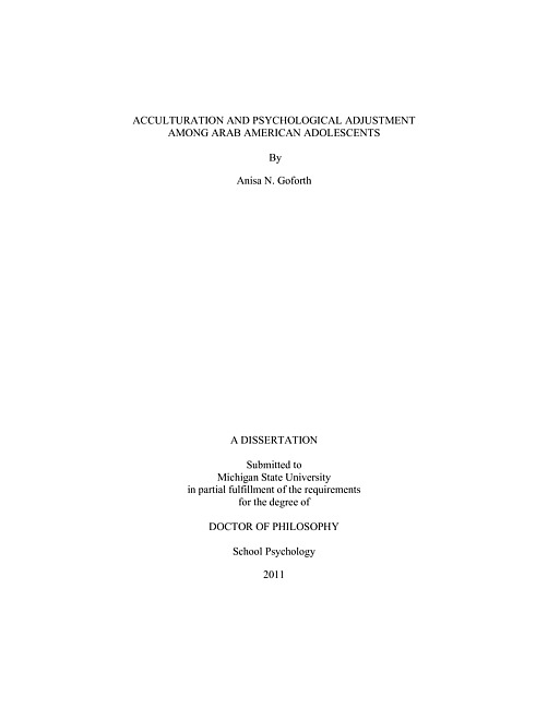 Whether having immigrated to or born in the United States, Arab American children and adolescents grapple with the degree to which they maintain their heritage culture's traditions and values, and the degree to which they participate in mainstream American traditions (Berry, 1997). As they enter adolescence, Arab American children are not only developing independence, a clearer sense of their personal identity, and closer friendships (Erikson, 1968; Phinney, 1989), but also negotiating multiple cultures and forging identities reflecting their Arab and American culture (Abu-Laban & Abu-Laban, 1999; Phinney, 1989). The goals of this research study were to investigate how acculturation and acculturative stress varied among Arab American adolescents, to determine whether acculturation and acculturative stress predicted psychological adjustment, to report incidence rates of psychological problems in this sample, and to determine whether there were differences between parents and adolescents on acculturation and whether these differences predicted adolescent psychological problems.One hundred thirty-five Arab American adolescents (ages 11 - 21) completed measures of demographic characteristics, acculturation, acculturative stress, religiosity, and social desirability. Parents (n = 76) also completed measures of demographic characteristics and acculturation. Results showed that acculturation varied by age, organizational religiousness, private religious practices, but not by religiousness, spirituality, length of time, or gender. Age, gender, religiosity and length of time in the U.S. were found to significantly predict heritage cultural orientation but not mainstream or integrated acculturation. Religiosity had the most unique influence in the model. Similarly, these characteristics significantly predicted acculturative stress. Results also indicated that acculturation and acculturative stress significantly predicted fewer psychological problems and lower overall competence. Parent's and adolescent's acculturation were also compared and found to be significantly different only on mainstream cultural orientation. Differences between parents and adolescents on mainstream cultural orientation significantly predicted increased symptoms of adolescent psychological problems, but differences on heritage acculturation orientation predicted fewer problems. Finally, incidence rates of psychological symptoms in this sample were similar to that of the general population These findings suggest that future research should more closely examine what role religion plays during the process of acculturation and how acculturation is related to psychological adjustment among Arab Americans children and adolescents. Future studies should also consider using a broader demographic of Arab Americans in the sample as well as conducting larger epidemiological studies of prevalence rates of psychological problems. Implications for school psychological practice were also considered.
