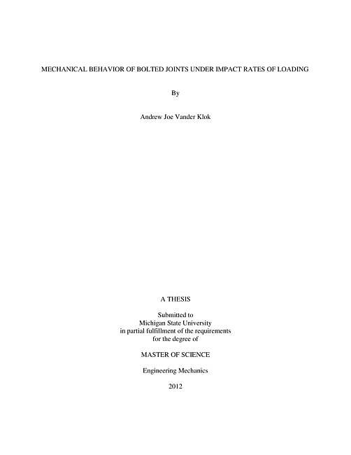 Bolted joints are extensively used in many automotive and aeronautical sectors where two members are bolted together. This particular method of fastening is vastly used in many industrial disciplines because it serves as an easy and non-destructive method to join and subsequently disassemble a complex structure. Since, bolted joints constitute an integral part of many structural components; this directly implicates the necessity to investigate the mechanical response of the bolted joints under a variety of loading rates to ensure structural integrity. Existing literature exists that addresses bolted joint failure for a myriad of different geometrical configurations and identifies the key parameters associated with it; for instance, non-dimensional ratios between the width of the joint (w), edge distance (e), diameter of the hole/bolt (d), and thickness of the joint (t). However, very limited literature exists addressing the structural integrity of these joints if subjected to time-dependent loading conditions (for example, impact).The present study aims at investigating dynamic mechanical behavior of bolted joints and the role of the non-dimensional parameters affecting joint failure. The Split Hopkinson Pressure Bar technique has been employed to characterize bolted joint failure under impact rates of loading for both compression and tensile loading conditions. Hole elongation and buckling are the key modes of failure under dynamic compressive loading conditions, whereas tear-out, tension, and cleavage failure constitutes the predominant failure modes under dynamic tensile loading conditions. An experimental method was developed for measuring and monitoring the response to the bolt preload during impact. It was determined that the asymptotic region of failure shifts from static to dynamic loading conditions.