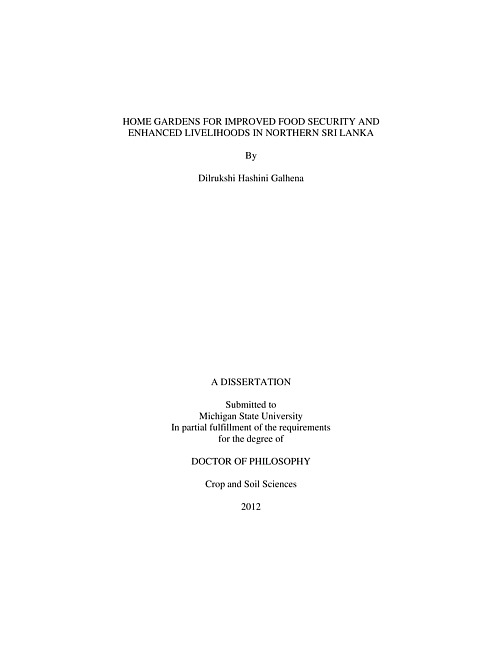 Food security remains a high priority for the government of Sri Lanka. As a part of the post-conflict rebuilding of Sri Lanka, the government is promoting establishment of home gardens for reducing hunger and malnutrition and improving livelihoods. Since the civil war ended in 2009, the government and non-governmental organizations have established more than 500 home gardens in the Northern region of Sri Lanka. This research was conducted in the Jaffna District of Sri Lanka which was severely affected by the conflict. The objective of this research was to investigate the role of home gardens in enhancing food security. This research study took a three prong approach. First, the past experiences of home gardens in developing countries were analyzed through a rigorous literature review. Second, the current role of home gardens as a supplemental source of food was analyzed using research data obtained through the survey of 167 home gardens. Finally, the findings of the research were used to develop innovative strategies to enhance home gardens. The global literature supports the positive contributions of home gardens towards enhancing food security in various contexts while pinpointing key constraints. The literature review supports the inclusion and promotion of home gardens as an eco-friendly sustainable agricultural practice to improve food security. The results of the survey of home gardens in Jaffna District indicated that as many as 29 useful plant species were found in home gardens. The home gardens were found to be diverse and were providing supplemental sources of fresh and nutritionally rich food products. The most important constraints identified were weeds, soil fertility, pests, shortage of capital and labor, and timely access to information and advisory services. The home gardeners strongly stated the need for training in specific areas such as bee keeping, composting, maintaining nurseries of planting materials, pest and soil management. Based on the needs and constraints identified by the home gardeners, four programs are proposed a collaborative activity between Michigan State University and University of Jaffna (UoJ). First, a model home garden will be established at the UoJ campus to serve as a research, education and outreach site. Second, a Master Home Gardener Program will be developed involving progressive gardeners to serve as trainers for other home gardeners. Third, a user-friendly manual on best practices in home gardening will be developed to enhance educational programs. Lastly, an innovative program will be launched using mobile phones to empower local home gardeners with up-to-date information on home gardening. Overall, the results of this research study indicate that home gardens are contributing to food security, income generation and livelihoods in the Northern region of Sri Lanka. When total value of produce per home garden was extrapolated to a million home gardens as per the long-term goals of the Sri Lankan government, the economic value was estimated to be nearly US $300 million. Based on these results, it is recommended that the home gardens program should be scaled-up and further expanded in other parts of Sri Lanka.