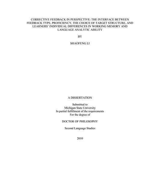Corrective feedback in perspective : the interface between feedback type, proficiency, the choice of target structure, and learners' individual differences in working memory and language analytic ability