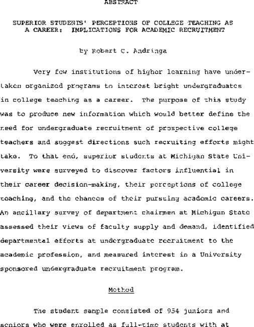 Superior students' perceptions of college teaching as a career : implications for academic recruitment