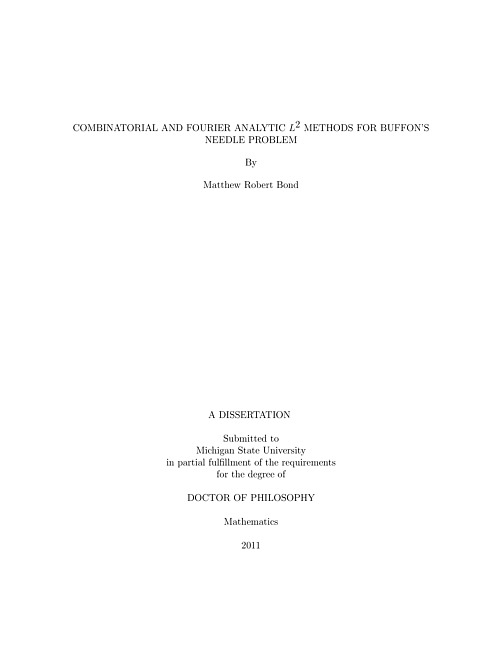 For interpretation of the references to color in this and all other figures, the reader is referred to the electronic version of this thesis.}\end{figure}In recent years, progress has been made on Buffon's needle problem, in which one considers a subset of the plane and asks how likely "Buffon's needle" - a long, straight needle with independent, uniform distributions on its position and orientation - is to intersect said set. The case in which the set is a small neighborhood of a one-dimensional unrectifiable Cantor-like set has been considered in recent years, and progress has been made, motivated in part by connections to analytic capacity.Call the set E, the radius of the neighborhood ε, and the neighborhood Eε. Then in some special cases, it has been confirmed that Buffon's needle intersects Eε with probability at most C|logε|-p, for p>0 small enough, C>0 large enough. In the special case of the so-called "four corner" Cantor set and Sierpinski's gasket, the lower bound C*log|logε|/|logε| is known, replacing the previously-known lower bound C/|logε| which is good for more general one-dimensional self-similar sets.In addition, the stronger lower bounds are still good if one "bends the needle" into the shape of a long circular arc, or "Buffon's noodle." The radius one uses can be as small as |logε|ε0$, for any ε0, with the constant C depending on ε0. It is unknown whether this condition or anything like it is necessary.Work continues on generalizing the upper bound results.