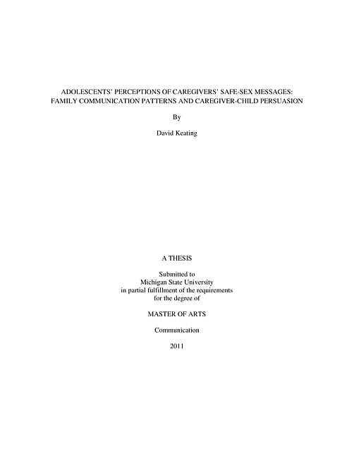 This thesis examined adolescent children's perceptions of caregivers' safe-sex messages in the larger context of their families' patterned communication. It was posited that caregivers from families that value open conversation are more likely to communicate safe-sex messages; children in families that value conformity are more likely to perceive caregivers' safe-sex strategies as effective and favorable; and children with high-conformity message sources are more likely to comply with caregivers' messages. Several research questions about different types of messages were also posed and the sources (e.g., adoptive mothers) and recipients (e.g., sons) were considered to examine the impact of biological sex on message outcomes. Participants were 13- to 18-year-olds that completed an online questionnaire. Results indicated that caregivers that communicated safe-sex messages were more likely to be high in conversation orientation, suggesting that caregivers who value open communication are more likely to initiate safe-sex talks. Although the predicted relationship between conformity orientation and message outcomes was not found, (a) participants who received messages from high-conversation, compared to low-conversation, sources reported higher intentions to comply with caregivers' safe-sex messages and (b) participants with pluralistic (i.e., high conversation, low conformity) message sources reported higher response efficacy scores than participants with protective (i.e., low conversation, high conformity) sources. Respondents' reports of response efficacy and attitude regarding caregivers' messages predicted their intentions to comply. Message content and biological sexes of interactants were not associated with differences in outcomes.