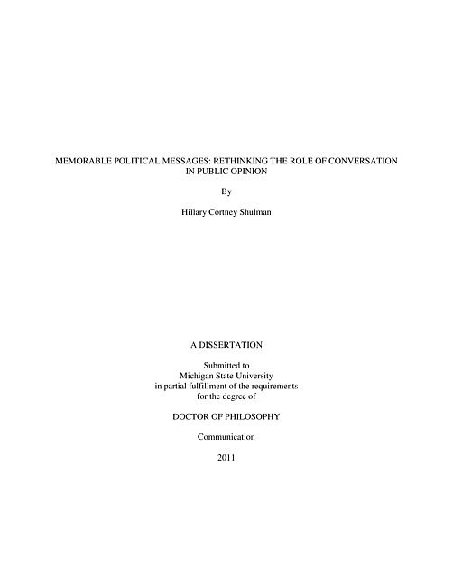 The focus of this dissertation research was to investigate students' memorable political messages. The memorable messages literature (Knapp, Stohl, & Reardon, 1981) has demonstrated that within domains other than politics, people have recalled messages that serve as a guide for their beliefs, attitudes, or behavior within that domain. This study extended this logic to the political realm in an effort to identify the content of political messages reported as memorable. By understanding what types of political messages people identify as being memorable or important, and through knowing characteristics about the source of these messages, more can be known regarding student's political development. Guidance from Burleson's (2009) message centered approach to interpersonal communication was used to deduce whether certain types of messages, coming from certain types of sources, were more likely to come from politically engaged participants. Thus, relationships between message substance, message source characteristics, and political engagement variables were also tested. In order to obtain students' memorable message, 191 participants were solicited from communication courses and asked to complete an online survey regarding their political opinions. After memorable messages were explained, students were asked to record their political memorable message if one existed. After students reported their message, several follow-up questions assessed including measures of message valance, the identity and role of the source, the channel through which the message was transmitted, and the perceived credibility and similarity of the source. Classification of memorable political messages was accomplished through an author-generated system and though a card sorting task (additional N = ??) and multidimensional scaling. This method led to the creation of a classification scheme for the content of memorable messages and tested whether message and source characteristics associated with political outcomes of interest including: scores on a political knowledge test, a political participation index, self-reported political interest, and an index created from these three measures representing a general engagement index. Results from this dissertation research suggest: a) a vast majority (98%) of students report having a memorable political message, b) the content of these memorable messages can be classified into ten content areas, c) students are more likely to report positive messages that originate from the mass media, and d) students who have the highest levels of political engagement tend to be those reporting a negative message from a non-credible source, or those reporting a positive message from a highly credible source. Although the latter relationship was predicted, the finding that negative messages were consistently reported from those interested and engaged in politics has several practical and theoretical implications discussed through the course of this manuscript.