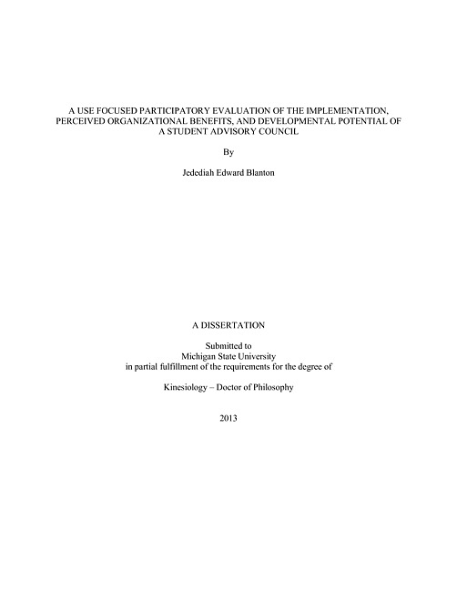 The primary motivation for this study was to formatively evaluate the Student-Advisory Council (SAC) for the Michigan High School Athletic Association (MHSAA). Specifically this study was designed to address four purposes: (1) to chronicle and evaluate the tasks and activities (actual and idealized) of the MHSAA SAC; (2) to evaluate the perceived organizational benefits of the SAC to the MHSAA and its executive staff and administration; (3) to investigate the perceived personal development gain or sense of empowerment experienced by the student-athletes; (4) to investigate the experience of being evaluated. These purposes were addressed through a two phase approach. Phase 1 was designed to address purposes 1 and 2. Four adult stakeholders were interviewed about the creation and purpose of the SAC as well as the perceived organizational (MHSAA) benefit of sponsoring the SAC program. Fourteen student-athlete members of the SAC were also interview in two focus groups and asked to explore the same phenomena. Phase 2 was designed to address purposes 3 and 4. Through the second phase, the evaluator interviewed two of the adult stakeholders and all 14 of the focus group participants individually to discuss the findings from Phase 1, the perceived sense of development experienced by the student-athlete members, and the perception of being evaluated. Phase 1 data revealed three goals of the SAC: (1) to gain a student's perspective on high school sports and present issues facing the MHSAA; (2) to promote the values of the MHSAA, both `to' and `through' students; (3) to provide an environment for student-athlete leaders to become exceptional leaders. Additionally a logic model describing the purpose and functioning of the SAC was created and presented back to the stakeholder. Phase 2 revealed that the SAC experience changed the student-athlete participants through increasing their social skills and confidence in their leadership. Additionally, student-athlete members reported feeling empowered over aspects of the SAC program, while also feeling somewhat undervalued by the MHSAA. The experience of participating in the evaluation was overall a positive and reflective experience.