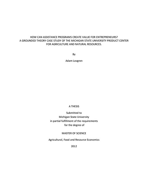 ABSTRACTHOW CAN ASSISTANCE PROGRAMS CREATE VALUE FOR ENTREPRENEURS?:ByAdam LovgrenEntrepreneurial Assistance Programs (EAPs) have been in existence in the United States since the late 1970s. However, there has not been conclusive evidence that quantitatively measures the value that EAPs provide for their clients. The primary cause for this lack of conclusive evidence is due in part to measurement concerns such as sample selection bias and clustering effects, and in part because of the lack of strong qualitative research that has examined the mechanisms of how EAPs create value for their clients. This research, therefore, has been done in order to shed greater light on the question "how do EAPS create value for their clients?" through a qualitative grounded theory case study approach in order to provide a theoretical framework to address the question of "how much value do EAPS create?" in later research. This was done through using the entrepreneurial process framework developed by Shane (2003) to interpret the results arising out of a case study of one particular EAP: The Michigan State University Product Center for Agriculture and Natural Resources. The results of this research indicate that EAPs can create value for clients by improving their clients' new venture's probability of success and survival through: (1) providing a check on cognitive biases in the strategic decision-making process; (2) assisting in the development of strategy and competitive advantages; (3) assisting to legitimize the new venture; and (4) serving as a direct and as an indirect tie to service providers, resource holders and trading partners.