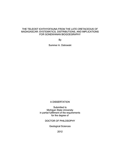 Madagascar is known for its highly endemic Recent fauna. However, the full deep-time temporal context of Madagascar's endemicity is not completely understood, due to the patchy fossil record of the island. The Upper Cretaceous deposits of the Maevarano Formation in northwestern Madagascar provide insight into this issue due to their rich vertebrate fauna, including dinosaurs, crocodylians, frogs, turtles, snakes, mammals, and fishes. The Maevarano Formation consists of fluvial and alluvial deposits and accompanying debris flows, and exhibits excellent fossil preservation. Fossil fishes from the formation represent coastal marine and freshwater taxa, some of which have been identified in earlier reports. This study focuses on identifying teleosts present within the Maevarano Formation, and the resulting implications for Gondwanan biogeography. The teleosts are first identified to the most precise taxonomic unit possible, and their distributions during the Late Cretaceous are analyzed. Several of the fish taxa present extend the known temporal and/or geographic ranges of significant teleost clades (e.g. Elopomorpha, Characiformes, and Cypriniformes). Parsimony Analysis of Endemism and Simpson's and Jaccard's similarity indices showed some fossil fish taxa (e.g. elopomorphs) as rather cosmopolitan and less affected by continental geographical relationships. The presence of the identified fishes from the Late Cretaceous of Madagascar fishes shows major turnover in fish diversity in Madagascar from the Triassic to the Recent, and how the faunal composition changed with the progressive isolation of Madagascar. Comparison at the ordinal level between the Triassic, Late Cretaceous, and Recent fish faunas show that the dramatic change in fish diversity is comparable with what has occurred in the strictly terrestrial vertebrate taxa over the last 200 million years of Madagascar's history. This information supports the likelihood of successive waves of immigrations of vertebrate taxa after the isolation of the island, some of which presumably would have had large enough establishing populations to persist on the island and diversify. These waves have resulted in a higher degree of endemicity in the island's fauna today, relative to the fauna which existed on Madagascar throughout its geological history. These results highlight the complexities of deciphering fish biogeography, due to their transient nature and their ability to disperse across marine environments that act as barriers to fully terrestrial groups.
