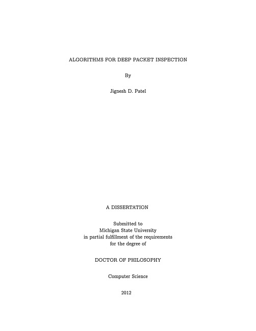The core operation in network intrusion detection and prevention systems is Deep Packet Inspection (DPI), in which each security threat is represented as a signature, and the payload of each data packet is matched against the set of current security threat signatures. DPI is also used for other networking applications like advanced QoS mechanisms, protocol identification etc.. In the past, attack signatures were specified as strings, and a great deal of research has been done in string matching for network applications. Today most DPI systems use Regular Expression (RE) to represent signatures. RE matching is more diffcult than string matching, and current string matching solutions don't work well for REs. RE matching for networking applications is diffcult for several reasons. First, the DPI application is usually implemented in network devices, which have limited computing resources. Second, as new threats are discovered, size of the signature set grows over time. Last, the matching needs to be done at network speeds, the growth of which out paces improvements in computing speed; so there is a need for novel solutions that can deliver higher throughput. So RE matching for DPI is a very important and active research area.In our research, we investigate the existing methods proposed for RE matching, identify their limitations, and propose new methods to overcome these limitations. RE matching remains a fundamentally challenging problem due to the diffculty in compactly encoding DFA. While the DFA for any one RE is typically small, the DFA that corresponds to the entire set of REs is usually too large to be constructed or deployed. To address this issue, many alternative automata implementations that compress the size of the final automaton have been proposed. However, previously proposed automata construction algorithms employ a “Union then Minimize” framework where the automata for each RE are first joined before minimization occurs. This leads to expensive minimization on a large automata, and a large intermediate memory footprint. We propose a “Minimize then Union” framework for constructing compact alternative automata, which minimizes smaller automata first before combining them. This approach required much less time and memory, allowing us to handle a much larger RE set. Prior hardware based RE matching algorithms typically use FPGA. The drawback of FPGA is that resynthesizing and updating FPGA circuitry to handle RE updates is slow and diffcult. We propose the first hardware-based RE matching approach that uses Ternary Content Addressable Memory (TCAM). TCAMs have already been widely used in modern networking devices for tasks such as packet classification, so our solutions can be easily deployed. Our methods support easy RE updates, and we show that we can achieve very high throughput. The main reason combined DFAs for multiple REs grow exponentially in size is because of replication of states. We developed a new overlay automata model which exploit this replication to compress the size of the DFA. The idea is to group together the replicated DFA structures instead of repeating them multiple times. The result is that we get a final automata size that is close to that of a NFA (which is linear in the size of the RE set), and simultaneously achieve fast deterministic matching speed of a DFA.