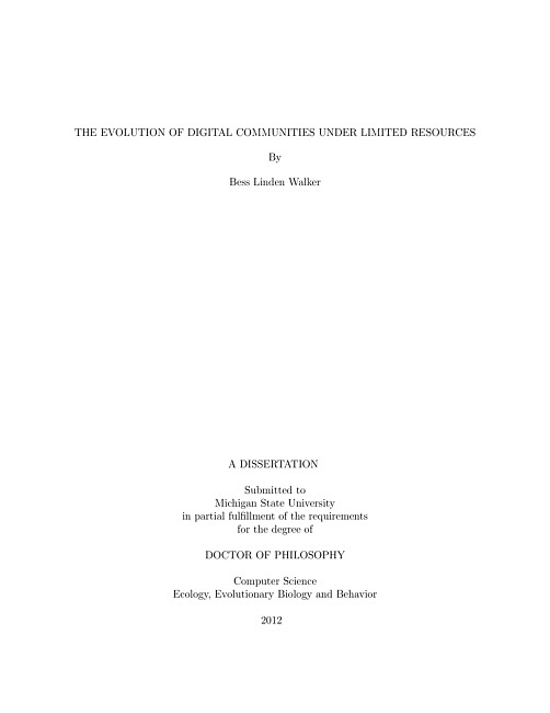 Schluter (1996) describes adaptive radiation as "the diversification of a lineage into species that exploit a variety of different resource types and that differ in the morphological or physiological traits used to exploit those resources". My research focuses on adaptive radiation in the context of limited resources, where frequency-dependence is an important driver of selection (Futuyma & Moreno, 1988; Dieckmann & Doebeli, 1999; Friesen et al., 2004). Adaptive radiation yields a community composed of distinct organism types adapted to specific niches.I study simple communities of digital organisms, the result of adaptive radiation in environments with limited resources. I ask (and address) the questions: How does diversity, driven by resource limitation, affect the frequency with which complex traits arise? What other aspects of the evolutionary pressures in this limited resource environment might account for the increase in frequency with which complex traits arise? Can we predict community stability when it encounters another community, and is our prediction different for communities resulting from adaptive radiation versus those that are artificially assembled?Community diversity is higher in environments with limited resources than in those with unlimited resources. The evolution of an example complex feature (in this case, Boolean EQU) is also more common in limited-resource environments, and shows a strong correlation with diversity over a range of resource inflow rates. I show that populations evolving in intermediate inflow rates explore areas of the fitness landscape in which EQU is common, and that those in unlimited resource environments do not. Another feature of the limited-resource environments is the reduced cost of trading off the execution of building block tasks for higher-complexity tasks. I find strong causal evidence that this reduced cost is a factor in the more common evolution of EQU in limited-resource environments.When two communities meet in competition, the fraction of each community's descendants making up the final post-competition community is strongly consistent across replicates. I find that three community-level factors, ecotypic diversity, community composition, and resource use efficiency can be used to predict this fractional community success, explaining up to 35% of the variation.In summary, I demonstrate the value of digital communities as a tractable experimental system for studying general community properties. They sit at the bridge between ecology and evolutionary biology and evolutionary computation, and offer comprehensible ways to translate ideas across these fields.