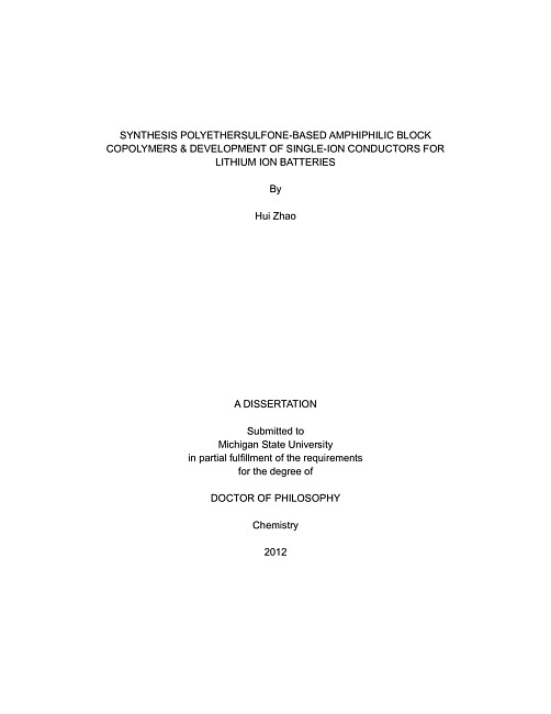 ABSTRACTSYNTHESIS OF POLYETHERSULFONE-BASED AMPHIPHILIC BLOCK COPOLYMERS & DEVELOPMENT OF SINGLE ION CONDUCTORS FOR LITHIUM ION BATTERIESByHui Zhao Polyethersulfone (PES) membranes often foul easily because of their hydrophobicity, and addition of amphiphilic PES block copolymers to membrane formulations may help overcome this problem. This dissertation explores the synthesis and aggregation properties of relevant amphiphilic ABA block copolymers, where PES is the hydrophobic B block and poly(2-hydroxyethyl methacrylate) or poly(2-hydroxypropyl methacrylate) are the hydrophilic A blocks. 1H nuclear magnetic resonance (NMR) spectroscopy, Fourier transform infrared spectroscopy (FT-IR) and thermogravimetric analysis (TGA) confirm the block copolymer synthesis, and 1H NMR spectra and TGA also provide consistent data on copolymer compositions. The amphiphilic copolymers aggregate when the amount of water in DMSO reaches 20 vol%, and dynamic light scattering (DLS) shows that aggregates have radii of ~60 nm at copolymer concentrations from 1 to 30 mg/mL.Lithium ion batteries are now ubiquitous, but concentration polarization is still a problem in the currently used battery electrolytes, especially in high-current applications. Immobilizing anions and having lithium cations contribute to most of the ionic conductivity is a good solution to address this problem of concentration polarization. This work aims to create nanoparticle-containing electrolytes using silica nanoparticles modified with polyanions that have Li+ as the counterion. Anion mobility is restricted by the polyanion polymer backbones, which is further immobilized by the nanoparticles. The polyelectrolyte-grafted nanoparticles were synthesized by surface atom transfer radical polymerization (ATRP) of monomers from initiator-grafted silica nanoparticles. To prepare a lithium-ion conductor, the polyelectrolyte-grafted nanoparticles were blended with poly(ethyleneglycol) dimethyl ether with Mw of ~500 (PEGDME-500). Because the anions are immobile, lithium is the only ion that conducts current. Four polyelectrolytes are used to form multilayer-grafted nanoparticles, aiming at improving conductivity of the material. FTIR and TGA are used to prove successful synthesis of the polymer modified particles. AC impedance shows that the best conductivity is from a Bis(trifluoromethanesulfonyl)imide (TFSI) analogue monomer, which is around 10-6 S/cm, which is in the same range as a monolayer-grafted silica nanoparticle system using similar TFSI analogue structure. A proposed model shows that the multilayer-grafted nanoparticles only have outermost layer of lithium cations accessible to the solution, because of the low solubility of polyelectrolytes in the PEGDME-500 solvent.Direct modifification of poly(ethyleneglycol) via alkyne-azide or thiol-ene click chemistry as single lithium ion conductor. To make sure 1,2,3-triazole or sulfur structure from click chemistry is not impeding lithium transport, we synthesize 1,2,3-triazole and sulfur containing PEGs via step growth polymerization. Conductivity measurement of lithium perchlorate with triazole containing PEG or sulfur containing PEG shows similar data as the pure PEG, which proves that click chemistry could be applied in the development of single ion conductors for Lithium Ion Batteries.