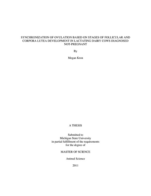 Cows that fail to conceive to 1st or subsequent inseminations are a major reproductive problem on dairy farms and commonly used re-synchronization programs are not as effective as pre-synch/Ovsynch programs for 1st AI. Ovsynch appears to be most effective when initiated during the 1st follicular wave of an estrous cycle when the dominant follicle is responsive to the 1st GnRH allowing the PGF2&alpha to be administered prior to natural luteolysis. Yet, most cows are in other stages of follicle and CL development at time of a not-pregnant diagnosis. Pre-synchronization programs are designed to synchronize cows that are in these other stages of follicle and CL development to the 1st follicular wave. The objective of this thesis was to test 3 re-synchronization programs (Ovsynch, G6G, and GGPG) tailored to 4 different stages of follicular and corpora lutea development in cows (n = 515) that did not become pregnant at 1st AI in order to synchronize cows to the 1st follicular wave at the start of Ovsynch. Conception rates were 27.8, 36.6, and 45.3% for Ovsynch, G6G, and GGPG, respectively, and were not statistically different. Heart girth measurements indicated that smaller cows had greater rates of luteolysis following the final PGF2&alpha of Ovsynch and a tendency for higher conception rates in cows with a mature CL. This could potentially be an artifact of incorrect dosage of PGF2&alpha and GnRH used in synchronization protocols. In Chapter 4, the relationship between linear type traits and reproduction in 2299 cows was examined. Cows with increased body volume traits (strength and body depth) consistently had poorer fertility, which agrees with our findings in Chapter 3.