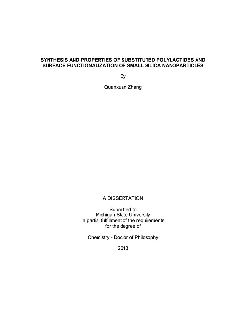 ABSTRACTSYNTHESIS AND PROPERTIES OF SUBSTITUTED POLYLACTIDES AND SURFACE MODULATION OF SMALL SILICA NANOPARTICLESByQuanxuan ZhangPolylactides have been widely studied as a degradable material in environmental and biomedical fields due to their biodegradability and biocompatibility. However, the applications of polylactide has been limited by its high crystallinity, hydrophobicity and lack of functionalization; so strategies that provide routes to functionalized polyesters are necessary to produce materials with the desired physical and chemical properties. Development of those strategies has been one of the major efforts to expand the application of polylactides, especially as degradable delivery vehicles. A series of propargyloxy lactic acid derivatives using poly(ethylene glycol) with different lengths as spacers between propargyl group and lactic acid were prepared with high yield via hydrolysis of cyanohydrin from inexpensive starting materials without using column purification. The versatility of the developed method was also tested by the survival of alkene group in the synthesis of allyloxy lactic acid. An azido lactic acid was also prepared to act as an alternative approach to render click function to polylactides. This allows for easy access of building up a library of clickable α-hydroxy acids to prepare clickable substituted polylactides.Post-polymerization modification via click chemistry provides a convenient route to functionalized polylactides with a variety of new properties. We prepared clickable polylpropargyloxylactide that have pendant propargyl groups available for the attachment of chemical functionality using click chemistry without degradation of polymer backbones. The clicked degradable polylactides have thermo-responsive properties with lower critical solution temperatures (LCST) from room temperature to 68 oC. The prepared amphiphilic copolymers, mPEG-b-polypropargyloxylactide were self-assembled into micelles which were core cross-linked to improve the structural stability of the micelles with better controlled release of cargo molecules and response to the reducing reagent.The relationship between the glass transition temperature (Tg) of polylactide and its backbone structure was studied. The direct attachment of rigid and bulky substituents can be used to tune the Tg and thermal properties of polylactides and broaden the scope of their physical properties.Silica nanoparticles (SiNPs) have attracted much attention due to their chemical inertness, low or non toxicity, excellent thermal stability and especially, easy access of surface functionalization. A facile grafting route was developed to prepare stably mono-dispersed SiNPs in aqueous media via click chemistry. Different sized SiNPs were grafted with a broad range of surface chemistries (carboxylic acids, amines, alcohols and methoxy-terminated polyethylene glycol chains). The resulted SiNPs were purified by dialysis and stably dispersed in water and in vitro cell culture media with narrow size distributions and no aggregation.