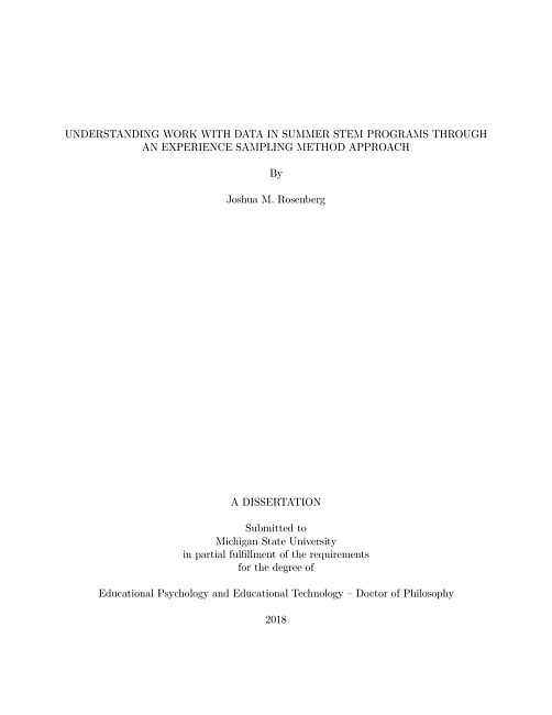 Data-rich activities provide an opportunity to develop core competencies in both science and mathematics identified in curricular standards. Perhaps even more importantly work with data puts learners in the position to use data to ask and answer questions, a potentially empowering capability. Research on work with data has focused on cognitive outcomes and the development of specific practices at the student and classroom levels, and yet, little research has considered learners’ engagement. The present study explores learners engagement in work with data in the context of summer STEM programs. The aspects of work with data that are the focus of this study are: asking questions, observing phenomena, constructing measures and generating data, data modeling, and interpreting findings. Data from measures of learners' engagement was collected through the Experience Sampling Method (ESM) that involves asking learners at random intervals to answer short questions about their engagement to discover profiles of learners' engagement.Data was collected from nine summer STEM programs over four weeks in the Northeastern United States. 203 learners reported 2,970 responses via short ESM surveys of how engaged they were (cognitively, behaviorally, and affectively, assessed through separate items) and of their perceptions of themselves (their competence) and the activity (its challenge). These data were used to examine five specific research questions: 1) What is the frequency and nature of opportunities for youth to engage in each of the five aspects of work with data in summer STEM programs? 2) What profiles of engagement emerge from data collected via ESM in the programs? 3) What are sources of variability for the profiles of engagement? 4) How do the five aspects of work with data relate to profiles of engagement? 5) How do youth characteristics relate to profiles of engagement?Findings show that aspects of work with data were fairly common overall, but that work with data was enacted out in varying ways, including some that were possibly highly engaging. Six profiles of youth engagement were identified, representing distinct configurations of the five indicators of engagement. Substantial variability in the profiles was present at the youth level, with less explained by the program youth were in or the nature of the particular instructional episode present at the times when youth were signaled. Relations between the profiles of engagement and each of the aspects of work with data were somewhat small: Notable exceptions were the generating data and data modeling were significantly associated with full engagement. Youth with higher pre-program interest in STEM were more likely to be engaged and competent but not challenged, though other youth characteristics were not highly related to the profiles.I discuss key findings as regards work with data in summer STEM programs and other informal learning environments, the nature of youths' engagement, and what factors can predict engagement. The design and goals of summer STEM programs, which are not (necessarily) focused on activities related to work with data, as well as other limitations including the measures for work with data used and the analytic approach, are identified and described. The role of generating data and modeling data as well as attention to the specifics of how work with data are enacted are presented as implications for practice. I highlight aspects of the findings and the implications for practice with respect to work with data in general and to engagement in informal learning environments, such as summer STEM programs, in both cases with an emphasis on how work with data can serve as a promising context for learning in STEM subject areas.