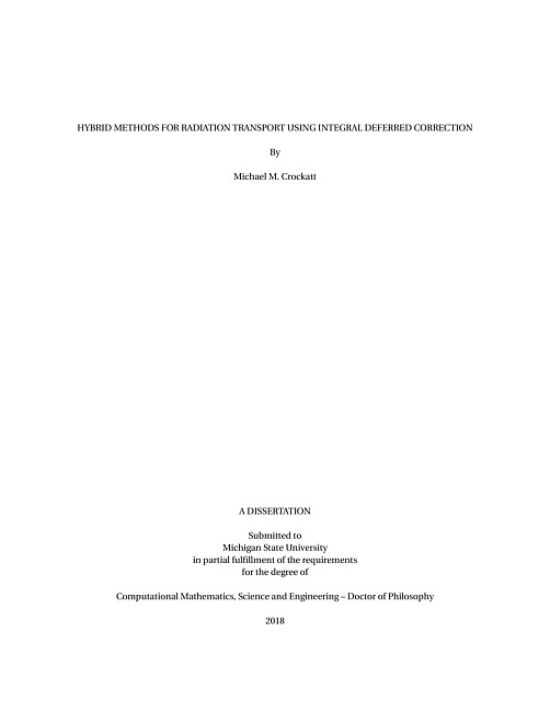 "This thesis provides roughly three contributions to the study of defect correction methods and hybrid methods for radiation transport. First, a modification of traditional integral deferred correction (IDC) time-integration schemes is proposed that significantly reduces the storage requirements of the methods. These methods, which we call low-storage IDC or LS-IDC methods, require storing only one copy of each stage vector throughout the iteration process, whereas traditional IDC methods require two copies of each vector. The convergence and stability properties of the methods are examined in a variety of settings, and both analytical and experimental results are provided. A nonlinear ODE and a linear transport equation are used to compare the accuracy and storage requirements of LS-IDC integrators with other fully implicit schemes including diagonally implicit Runge-Kutta (DIRK) and space-time discontinuous Galerkin (STDG) methods. The results demonstrate that LS-IDC methods have similar accuracy but significantly reduced memory requirements compared to other fully implicit methods. Second, extensions of a collision-based hybrid method for time-dependent radiation transport simulations are discussed. The hybrid methods are constructed by splitting the radiation flux into collided and uncollided components to which low- and high-resolution discrete ordinates approximations are applied, respectively. The use of arbitrarily high-order numerical approximations is emphasized, with particular attention paid to high-order time-integration schemes. A range of time-integrators are considered including DIRK, STDG, IDC, and LS-IDC methods of up to fifth-order accuracy. Convergence results in one spatial dimension are provided, and it is found that while the hybrid methods exhibit convergence stagnation and order reduction in certain scenarios, the overall accuracy of the hybrid approximations is comparable to standard discrete ordinates approximations in many cases. A test problem in two-dimensional x y-geometry consisting of a mock-up of a standard hohlraum configuration is used to compare the computational efficiency of the hybrid methods with standard discrete ordinates methods. It is observed that replacing a standard discrete ordinates method using an angular quadrature of order N with a hybrid discrete ordinates method using angular quadratures of order 2N and N/2 for the uncollided and collided fluxes, respectively, usually reduces solve time by a factor of 2 or more and in many cases also yields a reduction in solution error by a factor of up to 2. However, it is noted that the specified hybrid methods require approximately 4.25 times the storage of the corresponding standard discrete ordinates methods. Finally, two mechanisms for increasing the effectiveness of the hybrid methods are presented. The first is a reconstruction procedure for mapping between arbitrary discrete ordinates quadratures within the context of these hybrid methods. This approach, called Nyström reconstruction, is shown to be significantly more accurate than previous reconstruction methods. When applied to the two-dimensional hohlraum problem, it is observed that replacing a standard discrete ordinates method using an angular quadrature of order N with a hybrid discrete ordinates method using a Nyström reconstruction procedure and angular quadratures of order N and N/4 for the uncollided and collided fluxes, respectively, consistently reduces solve time by a factor of between 4 and 8 while increasing memory requirements by only 6% and producing little to no increase in solution error. Lastly, variations of hybrid methods using IDC integrators are described in which the hybrid approach is written as a two-grid iterative method in angle that is combined with an IDC time-integration scheme. It is demonstrated that the resulting methods are able to iteratively reduce the error due to the application of discrete ordinates quadratures of different resolutions to the collided and uncollided components."--Pages ii-iii.