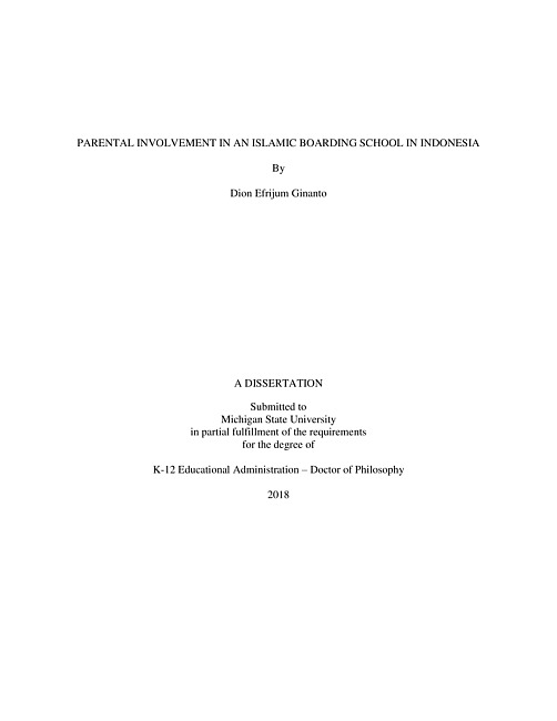 While the notion of parental involvement in developed countries has become important for students’ education, parental involvement in Indonesia has not been implemented very successfully (Karsidi et al., 2013; Fitriah et al., 2013; Majzub & Salim, 2011). In addition, the literature suggests that Indonesia still needs some additional effort to implement the notion of parental involvement both in day and boarding schools (Fitriah et al., 2013; Azizah, 2013; Subiyanti, 2007). Using a parental involvement framework by Epstein (2009), this study gives information on the level of parental involvement in Islamic Boarding Schools. This research also examined whether or not the parental involvement framework by Epstein, which has been widely used both in research and practice in the US and beyond, is applicable in an Islamic boarding school setting. Specifically, this paper explored in what ways Epstein’s model applies to parental involvement in Islamic boarding school. I also examined what family characteristics predict parental involvement models by Epstein.Using mixed methods, I conducted this study at an Islamic boarding school in one province in Indonesia, a country which has the biggest Muslim population in the world. Parental Involvement Framework developed by Epstein (2009) is applied as a theoretical framework for analyzing the data findings. The study found that five out of six parental involvement models were practiced by both parents and the school staff. Parenting, communicating, learning at home, volunteering, and collaborating with the community were identified during interviews, observations, and surveys. However, school policy decision making was not evident and observed. It was difficult to find evidence of parental involvement in decision-making processes from the data I collected. In addition to the six parental involvement models, I also found that there were four additional models applied in the school: material supporter, motivational/spiritual supporter, evaluator, and liaison. From the survey data, there were three parents’ characteristics that predict the level of parental involvement: parents’ income, parents’ background as a farmer, and number of siblings at school. Finally, even though Berjaya Boarding School (BBS) has been implementing parental involvement relatively well, the school needs to be aware of inequalities in parental involvement practices, such as that families from the lower socio-economic status tend to have lower opportunities to get involved in school activities or programs. One alternative approach to combat the inequity practice in this study is by adopting the culturally responsive school leadership approach (Ladson-Billings, 1995; Gay, 1994; & Khalifa et al. (2016).I believe that the Parental Involvement models by Epstein plus the expanded new models are suitable to be applied in Islamic Boarding Schools in Indonesia. However, the decision-making model is one area that needs to have more attention in future studies. Further research on a parental role in decision-making is strongly recommended. Finally, in addition to Epstein’s six parental involvement models, there must be other models that can also be applied in boarding school settings such as non-material supporters, material supporters, evaluators, and liaisons.