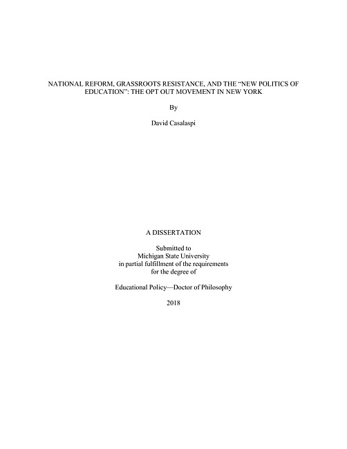 National reform, grassroots resistance, and the "new politics of education" : the opt out movement in New York