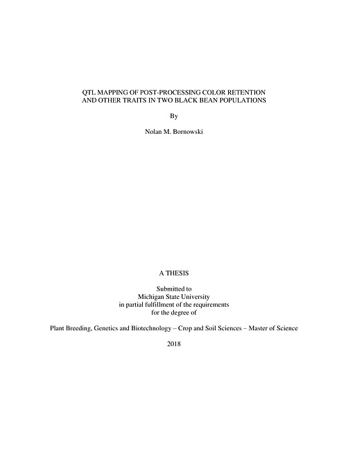 "When black beans are processed for consumption, they can lose their dark coloration due to the leaching of water-soluble pigments called anthocyanins. After hydrothermal processing, beans are commonly a faded brown color instead of the dark black color typical of the dry seed. The aim of this research was to develop mapping populations with different genetic sources of color retention in order to identify regions of the dry bean genome associated with canning quality traits. To this end, two half-sibling black bean recombinant inbred line (RIL) populations segregating for post-processing color retention were developed. These RIL populations were phenotyped for canning quality over two years and genotyped using the BARCBean6k_3 BeadChip. A novel phenotyping method using digital image analysis was shown to outperform current methods of quantitative color measurement. QTL for post-processing color retention were detected on six chromosomes, with QTL on Pv03, Pv08, and Pv11 being the most notable for their co-localization with QTL for quantitative measurements of color. In particular, QTL associated with color retention on Pv11 mapped to a very small physical interval and were consistent across years, populations, and phenotyping methodologies. Color retention QTL on Pv08 and Pv11 are good candidates for development of molecular markers that may be used in marker assisted selection (MAS) or early-generation screening to improve post-processing color retention in black beans."--Page ii.