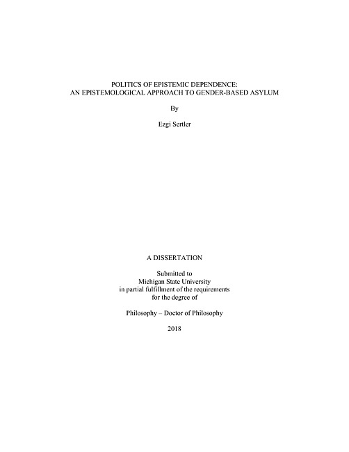 "My dissertation aims to build a bridge between analytic social epistemologies, feminist epistemologies, and refugee studies by bringing them into conversation on gender-based asylum cases, i.e. cases where gender-related persecution is the primary consideration for the determination of refugee status. It does so by using the concept of "epistemic dependence," which refers to our social mechanisms of reliance in the process of knowing, i.e. what we rely on and how we rely on it. In this dissertation, I argue that tracking problematic operations of epistemic dependence can provide an illuminating framework for understanding the epistemological impacts of the social and political structures that govern asylum claims." -- Abstract.