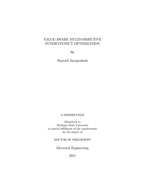 Geometrical scaling of critical semiconductor dimensions while keeping electric field constant improves logic delay and power consumption, but degrades global and semi-global interconnect delay. Repeater insertion and higher aspect-ratio wires partially alleviate interconnect delay, but adversely impact power consumption, temperature, and crosstalk noise. Although a number of interconnect design techniques have been proposed, they primarily target: (1) one or the other design metric, not all relevant metrics simultaneously and/or (2) random or worst-case traffic conditions instead of real-workload traffic, which is important because interconnect behavior (energy, delay, temperature, etc.) depends upon traffic value characteristics.To address the shortcomings of previous work, we present a value-aware interconnect design methodology that permits simultaneous optimization of multiple metrics in a prioritized manner tailored to target application requirements. Towards this end, we first survey existing commonly-used interconnect design techniques and analyze their influence on different interconnect circuit parameters and design metrics. From among these, we focus on wire spacing and data encoding as examples of two techniques to which we apply our value-aware methodology for optimization of interconnect energy, average delay, and peak wire temperature in the context of the SPEC CPU2k benchmarks. Next, we describe and compare two value-aware techniques that optimize energy savings within area constraints: partitioned hybrid encoding and value-aware wire spacing. Finally, we present three encoding techniques with increasing flexibility to adapt to traffic value characteristics: (1) static, which employs a single encoding mode, fixed at design time based on traffic value characteristics, in all cycles; (2) dynamic, which chooses the most suitable encoding mode in any given cycle from among two or more predetermined modes; and (3) adaptive, which selects the most appropriate encoding mode in any given cycle from among a set of modes that changes with traffic conditions at run time. These techniques provide increasingly greater benefits, with our static technique easily outperforming previous, more complex, but value-oblivious, dynamic encoding techniques.