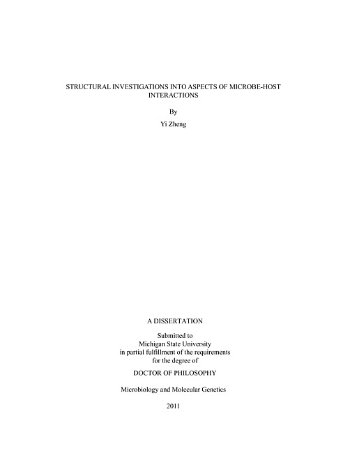 Microbes and host organisms continuously interact with each other and haveco-evolved delicate systems to cope with these interactions for survival. Investigating thisimportant relationship will lead to better understanding of the pathogenesis mechanism ofpathogenic bacteria for better protection as well as better utilization of the symbioticinteraction that will enhance the control of biomass accumulation in agriculture. Structuralbiology is an indispensible approach that can provide us information at the molecular levelto better understand the mechanism of the microbe-host interaction and to develop bettertreatments. In this thesis, three important proteins, namely YpfP from Bacillus subtilis,Sus1 from Arabidopsis thaliana and Eha proteins from pathogenic Escherichia coli O157:H7 were investigated by biochemical characterization as well as X-ray crystallography toprovide the knowledge base for future research.Structures of AtSus1 in complex with UDP and fructose were determined at resolutionsof 2.8 Å and 2.85 Å, respectively. These structures provided insights into sucrose synthesisand cleavage as well as the potential link between the AtSus1 activity and its spatialinteractions with cellular targets. They also helped to elucidate the retainingglycosyltransferase mechanism in a broader aspect. In addition, comparison of the retainingglycosyltransferase AtSus1 with an inverting glycosyltransferase revealed an interestingrelationship that the substrate specificity between the two might be related by a simpledomain rotation.Structures of EhaA, B, and D proteins from pathogenic E. coli O157: H7 werestudied by X-ray crystallography. Diffraction data were collected for EhaA, B, and DC-terminal β domains with the structure of EhaB_c successfully solved to 2.2 Å. Crystalswere also obtained for EhaA and EhaB full length proteins but further pursuit of crystalswith better diffraction quality are still required. Analysis of the EhaB_c structure revealedan interesting difference with other solved structures of the autotransporter translocationunits: EhaB_c has a significantly higher number of bulky aromatic residues inside thebarrel and a narrower channel indicated by the lower conductance measured in planarBilayer Lipid Membranes experiments. However, how these preliminary observations arerelated to the adhesion function of the Eha proteins is still unknown. Further detailedanalysis of structures and activity of Eha proteins is still needed to elucidate thisstructure-function relationship.A giant liposome assay was developed to assay the glycosyl transfer activity ofBsYpfP. It transfered two glucose moieties to the diacylglycerol with lipid chain varyingfrom C10:0 to C18:1 in this assay. The initial unsuccessful efforts of crystallizing BsYpfPled to an investigation of the fusion module method to facilitate its crystallization. Crystalswere obtained with the N-terminal fusion protein of the helix-turn-helix module from TagFprotein, but they diffracted poorly. However, this effort offered a clue for the crystallizationconditions as well as valuable experience on this method. Further manipulation andcharacterization are still needed to obtain diffraction quality crystals.