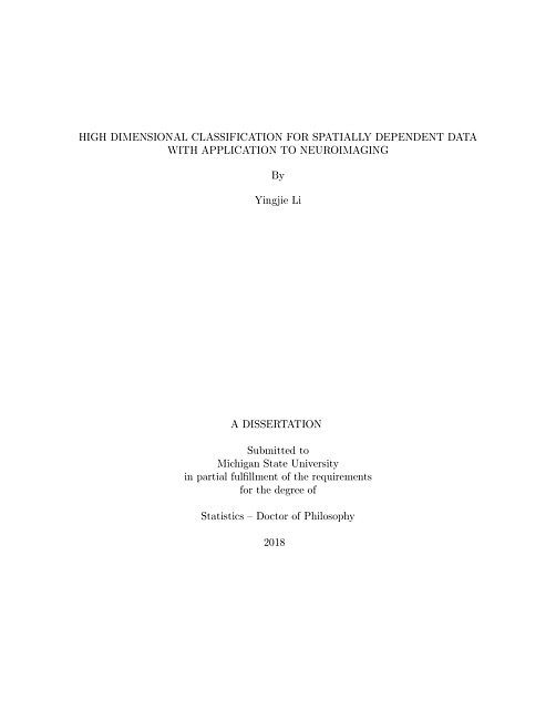 The methods developed in this thesis are motivated by how to use structure Magnetic resonance imaging (MRI) data to predict Alzheimer’s disease (AD) or to discriminate between healthy subjects and AD patients. Imaging data is a typical example of spatially dependent data where the correlation between data points collected at various voxels (pixels) can be described by proximity. Also, it is high dimensional data since the number of voxels is extremely high comparing to the number of subjects.The first piece of work considers use longitudinal volumetric MRI data of five regions of interest (ROIs), which are known to be vulnerable to Alzheimer’s disease (AD) for prediction. A longitudinal data prediction method based on functional data analysis is applied for identifying when an early prediction can reasonably be made and determining whether one ROI is superior with regard to predicting progression to AD over others. By adopting statistically validated procedures, we compared the prediction performance based on individual ROIs as well as their combinations. For all the models, the results show that the overall one year, two years, three years in advance prediction accuracy is above 80%. MCI converter subjects can be correctly detected as early as two years prior to conversion.The second piece of work considers use voxel level MRI data for classification of AD patients and healthy subjects. A supervised learning method based on the linear discriminant analysis (LDA) was developed for high dimensional spatially dependent data. The theory shows that the method proposed can achieve consistent parameter estimation, consistent features selection, and asymptotically optimal misclassification rate. The extensive simulation study showed a significant improvement in classification performance under spatial dependence. We applied the proposed method to voxel level MRI data for classification. The classification performance is superior compared to other comparable methods.