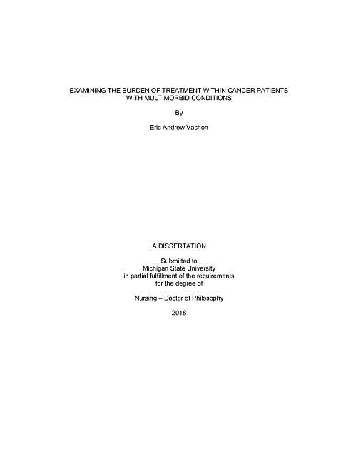 The purpose of this dissertation was to examine the concept of burden of treatment (BOT), from both a conceptual and operational perspective, within cancer patients with multimorbid conditions. BOT is the combination of a patient’s workload to manage their conditions, and the patient’s perspective of that workload and their conditions. Manuscript one was a conceptual analysis and development of a conceptual model focused on the BOT of cancer patients with multimorbid conditions. Manuscripts two and three were secondary data analyses that utilized data from a parent trial study. The parent trial was a multi-site, randomized controlled trial (RCT) that tested an adherence and symptom management intervention in cancer patients that were newly prescribed oral oncolytic agents (OOA) over 12 weeks. Manuscript two examined patients’ OOA acquisition, defined as the number of days from the time of initial prescription until patients received their drug. This manuscript also examined how baseline disease/treatment factors (OOA drug class) and healthcare system factors (insurance type, recruitment site, and OOA copay) might predict the time to acquisition. All 272 patients form the parent trial were included in manuscript two. The number of days to acquisition was collected from the patient during the baseline telephone interview. The sample was evenly split between males and females, had a mean age of 61 years (SD=12.2), and was primarily Caucasian (89%). Patients waited on average 9.73 days from the time of initial prescription to receive their OOAs (range 0-135 days). ANOVA results showed that those that had a copay waited longer to receive their OOA (P = .02). Additionally, there was a significant interaction effect between OOA drug class, insurance type, and OOA copay (P = .01). Simple interaction effects showed significant acquisition times for those prescribed kinase inhibitors, F (1, 114) = 6.709, p .01, and sex hormone inhibitors, F (1, 19) = 7.879, p .01, depending on the type of insurance and whether or not individuals had a copay. Manuscript three operationally tested the conceptual model developed in manuscript one. This chapter examined the direct relationship between baseline antecedent characteristics and temporary stoppages of patients’ OOA regimens. Additionally, BOT-indicator variables were examined for a moderation effect on this direct relationship. OOA regimen complexity was utilized for the patient workload component of BOT, while patients’ rating of their symptom interference on daily activities was used for patient perspective. More than 36% of patients in the parent trial experienced a temporary stoppage of their OOA regimen over 12 weeks. The moderation, interaction terms between BOT and multimorbidity were statistically non-significant. However, females (P = .02) and those prescribed kinase inhibitors (P < .01) were more likely to experience temporary stoppages when compared with males and other OOA drug classes, respectively. Burden of treatment is a recently developed concept that will be valuable to research and practice as the prevalence of individuals with cancer and multimorbid conditions continues to increase. An individual’s BOT can be related to the tasks required of them to manage their conditions, as well as the perspective they have about these tasks and conditions. This dissertation provided conceptual insight into the BOT experienced by cancer patients with multimorbid conditions, as well as the negative outcomes they may experience if their burden becomes too great. Patients may experience long wait times to receive cancer treatment that is vital, given their critical disease status. Although non-significant, there was a descriptive trend of more multimorbid conditions being associated with a greater proportion of temporary stoppages, as well as sex and drug class having an impact on these treatment modifications. The current literature does not adequately describe the burden of treatment experienced by cancer patients. Future research and practice guidelines are needed to help identify and ease the burden of treatment that individuals with cancer and multimorbid conditions experience.