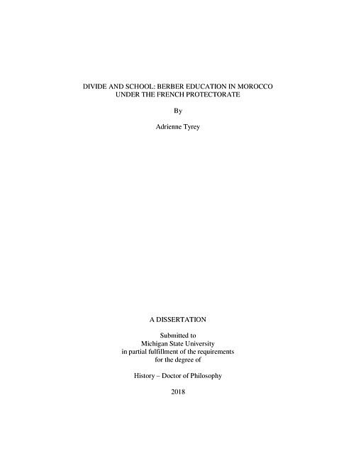 When the 1912 Treaty of Fes created the French Protectorate of Morocco, the new French administration took charge of a modernization project that included developing a public education system. Avoiding oversight by the Sultan and his government, they instead created separate systems for Arabic-speaking and Berber-speaking Moroccan youth in an effort to artificially separate the population along ethnolinguistic and geographic lines. Whereas much of the existing scholarship on the Protectorate of Morocco focuses on urban Arab nationalism, this dissertation addresses the outcomes of French Berber policy within Berber communities themselves. The lens of education reveals a space of unusually intimate interaction between French functionaries and Berber youth. Based on a Berber myth that placed Berbers higher than Arabs on a European pseudoscientific racial hierarchy, the system of Berber schools was meant to train an intermediary elite class that would serve the French colonial project and turn Berber loyalties from the Sultan to France. Instead, the inequalities and injustices of the imperial order spurred student activism in both Arabic- and Berber-oriented schools, confounding the French educators charged with their instruction and discipline. Drawing on archival and oral sources gathered in Nantes, Aix-en-Provence, and Rabat, this dissertation examines the ideological underpinnings, practical implementation challenges, day-to-day administration, and unintended consequences of the bifurcated public education system implemented by the French in Morocco. I first analyze the rise of ethnography as a colonial science and of ethnographic expertise as both justification of colonialism and a means by which colonial administrators jockeyed for rank and authority. Following the development of a colonial ethnographic archive, I examine the practice of sending French ethnographic researchers with the military in their “Pacification” exercises in southern and eastern Morocco from 1912 until 1934. In addition to rendering Berber country legible to the new centralized administration, this enabled the creation of ad hoc schools that focused on teaching French, which later grew into the Berber school system. An examination of the deliberate creation of separate systems for Arab and Berber youth exposes that the Berber schools were intentionally kept secret from the Sultan and his Makhzen administration, despite French promises of transparency. A narrative history of the Collège Berbère d’Azrou as the keystone of this separate, clandestine educational project reveals that efforts to suppress Arabic language education in the Berber schools had both practical and ideological pitfalls, leading to a backlash that rocked the school in a volatile moment of war and rebellion. Finally, through a case study of Arsène Roux, founder of the Collège, I examine the ambiguous role of a talented and well-intentioned educator and scholar within the exploitative colonial system. By tracing the development of the Berber myth and its use in shaping policy in the Moroccan context, this project prioritizes the experiences of Berber and French individual actors and analyzes the creation of Berber schools as the epitome of colonial divide-and-rule strategies. It decentralizes the urban nationalist movement, arguing instead that activities in the supposed “land of anarchy” provide a clearer understanding of the beliefs and practices of the Protectorate administration. Finally, I contribute to the discussion of how deliberately divisive colonial strategies not only created their own resistance within colonized populations but continue to undergird ongoing divisions and inequalities in postcolonial societies.