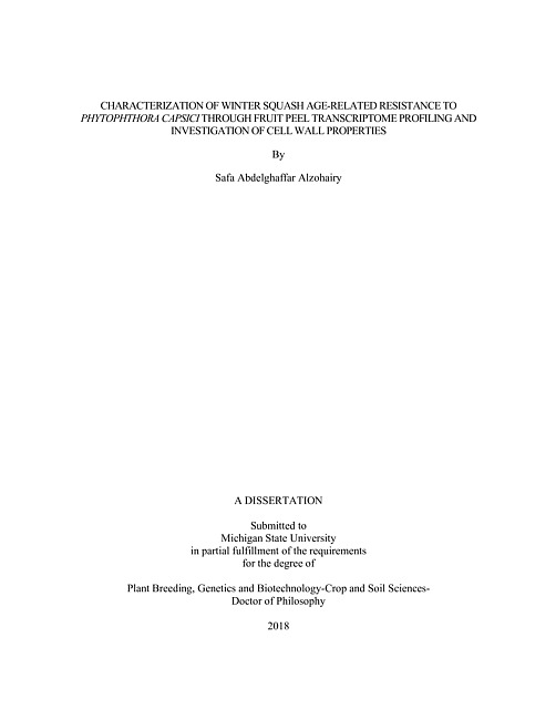 Fruit rot of winter squash and pumpkin (Cucurbita moschata) caused by the oomycete plant pathogen Phytophthora capsici is a limiting factor in the production of these crops. Genetic resistance to fruit rot is not available in commercial cultivars, but age-related resistance (ARR) develops in certain cultivars of C. moschata which may benefit management strategies. Earlier ARR studies indicate that the peel provides fruit resistance. The goal of this research was to elucidate the structural, biochemical and genetic basis of ARR of the winter squash fruit peel to P. capsici. Five C. moschata cultivars were evaluated for P. capsici resistance 10, 14, 16, 18, and 21 days post pollination (dpp). The onset of resistance was variable among cultivars. A cultivar with ARR at 14 dpp was selected and the fruit exocarp cell wall examined 7 dpp (susceptible) and 14 dpp, 21 dpp (resistant) using scanning electron microscopy (SEM). An increase in cuticle and epidermal walls thickness as the fruit age increased was observed. According to SEM observations, P. capsici caused cell wall degradation/tissue collapse to the 7 dpp fruit within 48- hour post inoculation (hpi) while 14 and 21 dpp fruit remained unaffected suggesting a structural barrier to P. capsici in resistant fruit. The contribution of fruit exocarp preformed or induced chemical defense against the pathogen was examined in C. moschata cultivars across developmental stages using phytochemical analysis. Results showed a decrease in antifungal activity in non-inoculated fruit peel as the fruit age increased. A significant change in antifungal activity was not observed under induced conditions with inoculation of the fruit peel with P. capsici, suggesting that there is not a correlation between preformed or induced chemical defense and winter squash fruit ARR to P. capsici. Transcriptome profiling of fruit peel of two C. moschata cultivars at susceptible and resistant developmental stages was performed to uncover the molecular mechanism of ARR. Differential gene expression analysis detected upregulation of multiple genes in the resistant compared to the susceptible stages then functional enrichment analysis detected overrepresentation of these genes in cell wall structures biosynthesis. Pathway enrichment analysis of winter squash orthologous genes detected enrichment in cutin, suberin monomers and phenylpropanoids biosynthetic pathways. Further analysis of genes expression profile in those pathways suggests enrichment in monolignol biosynthesis in the resistant fruit peel.