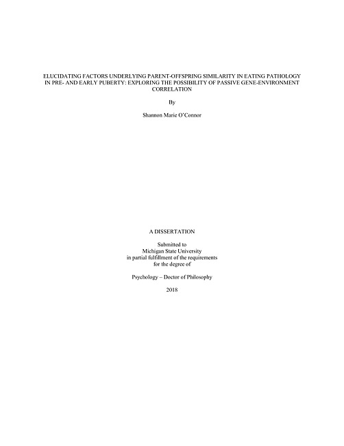 "Objective: Eating pathology has been found to aggregate in families. Typically, familial resemblance has been attributed to parents providing an environment that leads to the development of eating pathology. However, offspring raised by biological parents receive both their environment and genes from their parents, raising the possibility that genetic influences, environmental influences, and/or gene-environment interplay may account for familial resemblance. Past studies have not explored the possibility of parents' genes influencing the environment they provide (i.e., passive gene-environment correlations or "passive rGE"). If present, passive rGE is most likely to "hide" in estimates of shared environmental influences in classical twin models. The current study used a nuclear twin family design to explore the possibility of passive rGE during pre-/early puberty when past studies have demonstrated the importance of shared environmental influence. Additionally, the present study explored whether sibling-specific (i.e. influences specific to the twin generation) or family-specific (i.e., "cultural" influences within the home) shared environmental influences accounted for shared environmental influences found in past studies. Methods: Participants included pre-/early pubertal twins and their biological parents from the Minnesota Twin Family Study and the Michigan State University Twin Registry. Disordered eating (i.e., overall disordered eating, body dissatisfaction, weight preoccupation, binge eating) was assessed with self-report measures in the twins and parents. Pubertal status was determined using an established cut-off on a self-report measure. Results: Passive rGE was not indicated in pre-/early puberty. Instead, sibling-specific (not family-specific) shared environmental and nonshared environmental influences were most influential. Conclusions: Future research should explore parental influences that may impact the twin generation only (e.g., parenting style, parents' comments about weight/shape to their offspring, etc.), as this would be represented by sibling-specific environmental influences."--Page ii.