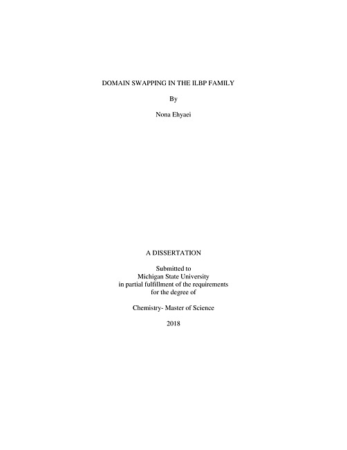 ABSTRACTSTUDY OF DOMAIN SWAPPING OF ILBP FAMILY ByNona EhyaeiIntracellular lipid binding proteins (iLBPs) are small soluble proteins in cytosol responsible for transport of different insoluble hydrophobic molecules. Members of this family have relatively the same structures including ten stranded beta barrel and two alpha helices located at the mouth of the internal binding cavity like a cap for binding pocket of these proteins. Studies that have been done on folding pathway of iLBP reports the early beta barrel formation in the folding pathway for this family of proteins.Human cellular retinol binding protein II (CRBPII) is a member of the iLBP family and is responsible for transport of retinal and our group have been using this protein in an effort to create rhodopsin mimics to create Schiff base with retinal. During studies on hCRBPII for protein design, my former lab mates discovered a domain swapped dimer for this protein. Domain swapping is a process by which two or more monomers exchange an identical part of their structures to form dimer or higher order oligomers. The swapped region in this protein is three beta strands with two alpha helixes which is about half of the protein.Surprisingly, mutational studies on hCRBPII have shown that with single mutation, we can change the ratio of monomer and domain swapped dimer which are folding products in folding pathway of this protein. We tried to find the effect of different residues on domain using ourstrategy called “Phase-problem”. Existence of domain swapping for hCRBPII, can have physiological relevant and may affect the folding pass way for this family of proteins.In the meanwhile, another member of the iLBP family, Fatty acid binding protein 5 (FABP5), has reported to have a very similar domain swapped dimer. This protein is found mostly in epidermal cells, but also in other tissues, such as brain, liver, kidney, lung, and adipose tissue. Existence of domain swapping in Holo FABP5 is very interesting for us, since this protein is in the same family as hCRBPII and we are interested to investigate on the structure of Apo FABP5. In the course of these studies, we resolved two domain swapped structures of FABP5 bind to palmitic acid and studied the melting points of monomer and dimer FABP5 relative to each other.Existence of domain swapping for hCRBPII and FABP5 may lead to allosteric regulation, also huge effect on the folding passway for this family of proteins. Previously, all studies in our lab for domain swapping was through bacterial expression, however, in order to check the physiological relevance of this phenomena we made studies on mammalian expression of hCRBPII. We successfully expressed this protein in HeLa cells and got closer to find the size of this protein in mammalian expression by using size exclusion chromatography and western blotting.