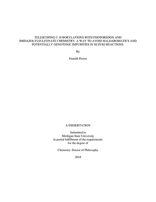 ABSTRACTTELESCOPING C–H BORYLATIONS WITH PHOTOREDOX AND IMIDAZOLYLSULFONATE CHEMISTRY: A WAY TO AVOID HALOAROMATICS AND POTENTIALLY GENOTOXIC IMPURITIES IN SUZUKI REACTIONSByDamith PereraCross-coupling reactions are a mainstay of drug candidate synthesis. Owing to this prominence, the American Chemical Society’s Green Chemistry Institute's Pharmaceutical Roundtable deemed cross-couplings that avoid halogenated aromatics (C–H activation) as their top aspirational reaction. To meet this aspiration, we have worked to develop iridium-catalyzed C–H borylations as a practical approach for directly converting arenes and heterocycles into nucleophilic cross-coupling partners. This chemistry not only obviates the need for halogens in the preparation of aryl and heteroarylboronic esters, but with hydrogen gas as the only stoichiometric byproduct of these chemoselective reactions, we and others have shown that Ir catalyzed borylations can be combined with other chemical events enabling a multitude of one-pot processes. Among these telescoped reaction sequences, we established C–H borylation/oxidations as a novel route to phenols, including phenols that often bear otherwise difficult to access contra-electronic substitution patterns. Herein we discuss the development and further advancement of the scope and green features of this chemistry by performing in situ oxidation of the boron under photoredox conditions. Furthermore, as phenols can be readily converted to sulfonates, we have expanded the reach of iridium-catalyzed borylations and use C–H activation to eliminate the need for halogenated cross-coupling electrophiles. Thus we have developed a one-pot C–H borylation/ photoredox oxidation/ sulfonation sequence. In recognition of the potential safety-genotoxicity issues related to triflates, mesylates and tosylates this sequence was built so as to enable the generation of imidazolylsulfonates (ArOSO2Im) as the final cross-coupling electrophile. We also telescoped sequence that does not conclude with the imidazolylsulfonate formation. Rather the final aim was the establishment of a one-pot sequence that joins the efficiency of C–H borylation with the environmentally friendly aspects of photoredox chemistry and the safety features of imidazolylsulfonates. Namely we have established a one-pot C–H borylation/photoredox oxidation/imidazolylsulfonation/Suzuki coupling sequence.In the second part of this dissertation, the use of high-throughput experimentation for the discovery of cheap, readily available catalytic systems, namely bismuth(III) acetate and silver oxide for selective deborylation of polyborylated substrates will be discussed. Bismuth (III) acetate is a safe, inexpensive, and selective facilitator of sequential protodeboronations, which when used in conjunction with Ir-catalyzed borylations allows access to a diversity of borylated indoles. The versatility of combining Ir-catalyzed borylations with Bi(III)-catalyzed protodeboronation is demonstrated by selectively converting 6-fluoroindole into products with Bpin groups at the 4-, 5-, 7-, 2,7-, 4,7-, 3,5-, and 2,4,7- positions and the late-stage functionalization of sumatriptan. Further elaboration of the reactivity of Bi(OAc)3 for heteroarene substrates and Ag2O for arene substrates including deborylation/deuteration studies are discussed. Ir-catalyzed C–H borylations of aromatic compounds often allowed achieving the kinetically favored product. Herein a procedure to achieve reversibility in the catalytic borylation was studied with excess borylating agents and higher catalyst loads to obtain a novel thermodynamic borylated product, which cannot be obtained under usual Ir-catalyzed borylation methods.
