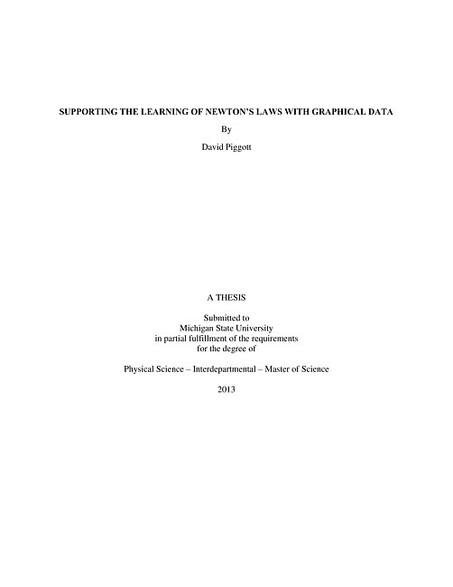 ABSTRACTSUPPORTING THE LEARNING OF NEWTON'S LAWS WITH GRAPHICAL DATAByDavid PiggottTeaching physics provides the opportunity for a very unique interaction between students and instructor that is not found in chemistry or biology. Physics has a heavy emphasis on trying to alter students' misconceptions about how things work in the real word. In chemistry and microbiology this is not an issue because the topics of discussion in those classes are a new experience for the students. In the case of physics the students have everyday experience with the different concepts discussed. This causes the students to build incorrect mental models explaining how different things work. In order to correct these mental models physics teachers must first get the students to vocalize these misconceptions. Then the teacher must confront the students with an example that exposes the false nature of their model. Finally, the teacher must help the student resolve these discrepancies and form the correct model. This study attempts to resolve these discrepancies by giving the students concrete evidence via graphs of Newton's laws. The results reported here indicate that this method of eliciting the misconception, confronting the misconception, and resolving the misconception is successful with Newton's third law, but only marginally successful for first and second laws.
