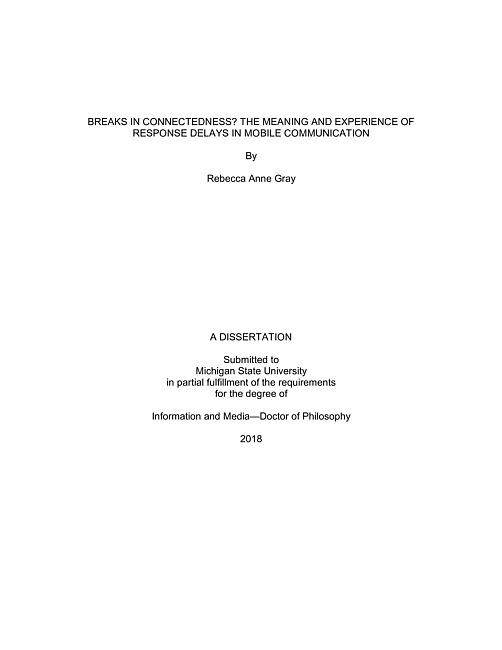 Individuals are communicating with one another to an increasing extent on mobile phones, which have enabled them to carry on conversations with others from nearly wherever they are and throughout whatever they are doing during the day. Maintaining connections with others through mobile phones contributes both to a need for synchrony in communication across mobile devices as well as to perceptions of increased accessibility to others - expectations that others are available to us as needed or desired. However, feelings of accessibility to others do not always signify true, uninterrupted access to others, as individuals may be unavailable to communicate for a number of reasons or unresponsive even when available. In order to understand the meaning of response delays in mobile interaction for individuals’ sense of connectedness to others, I interviewed emerging adults to engage in discussion with interviewees about their experiences of delayed responses from communication partners, unpacking the impact these delays may or may not have had on their sense of connectedness to them. I found that our cohort’s response time expectations were heavily informed by prior communication experience with communication partners and social norms, as posited by expectancy violation theory (Burgoon, 1988), which lays out a framework for predicting antecedents to nonverbal behavior expectancies and outcomes of violations to those expectancies. Perceived availability of communication partners was another recurring, important driver of responsiveness expectations. In close dyads, it appears that availability expectations may be even more precise than they would otherwise be with other communication partners given the increased access to information they have about others’ schedules as well as the more extensive prior communication experience. With these more precise availability expectations come potentially more severe or concerning reactions to expectancy-violating response delays.The lack of a shared environmental context in mobile communication can render it impossible to know another’s true availability to respond, no matter how “fine-tuned” or precise one’s expectations of availability are. This introduced a new layer of complexity in individuals’ interpretations of response delays, especially in cases where availability of a communication partner was presumed but a response was still not received. Reactions to response time violations included emotional reactions and compensation behaviors (such as modality switching) as predicted by the expectancy violation framework. We did not observe evidence that repeated response time violations hurt relationships with primary, typically close communication partners in any detectable way to the interviewees. Most response time violations with main communication partners that were discussed with participants were forgiven, described post-hoc as excusable instances of non-response based on later-realized circumstances.Based on these interviews and our findings, I recommend future work to continue to unpack the complexity of availability, seeking to better determine the impact of misconceived notions of availability on the evaluation of response delays. I also propose that future work dig more deeply into the role of communicator reward valence on the interpretation of and reaction to response delays in mobile communication.