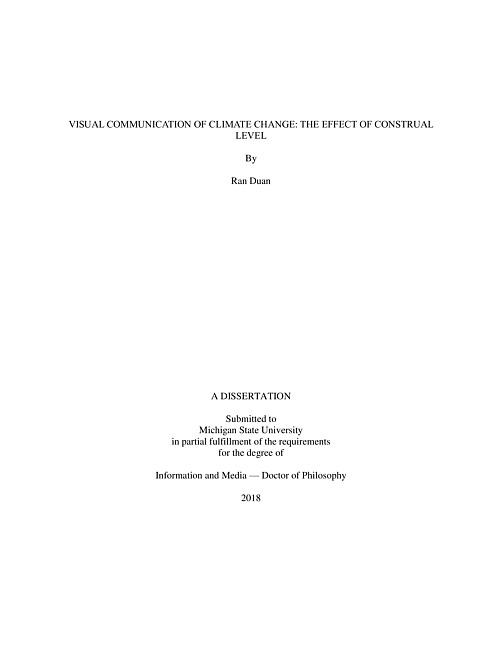 There is widespread consensus among the scientific community that human-caused climate change is occurring and is one of the most urgent threats facing our planet in the twenty-first century. However, Americans’ concern for climate change is relatively low compared to most regions around the world. Researchers have argued that one important reason for this indifference toward climate change may be the perception that the risk is abstract and psychologically distant, that is, its uncertain impacts will affect other people, will happen in other places or sometime in the future. Today, how to effectively communicate climate change in a way that makes the issue more real, local, urgent and relevant is a challenge. Addressing this challenge, this study drew upon construal level theory to investigate the role of abstraction in the visual communication of climate change. Two online experiments were conducted to test how the level of abstraction and concreteness of climate change imagery affects viewers’ psychological distance of climate change, concern for climate change, behavioral intentions toward climate change mitigation and adaptation. This study firstly clarified how psychological distance should be conceptualized, operationalized and integrated into climate change communication efforts by demonstrating the distinction between egocentric and nonegocentric distances. This paves the way for broader applications of psychological distance in decision-making research. Second, results from this study showed abstract images (vs. concrete images) encouraged more abstract thinking, leading people to perceive greater spatial, temporal and social distance between climate change and themselves. The greater psychological distance perceptions further discouraged people’s concern for climate change and intention to act, though the effect was small relative to other environmentalism factors such as self-efficacy and self-transcendent values. These findings show the potential usefulness of abstract versus concrete messaging strategies for future environmental and behavioral research. Last, findings revealed that an image’s level of abstraction moderated the effect of key sociopolitical factors (self-efficacy, self-transcendent values, political orientation) on climate change related attitudes and behavioral intentions. This finding expands the current literature by providing a clearer understanding of the psychological mechanisms in climate change visual communication; it emphasizes how previously identified communication strategies for concretizing climate change may backfire and how climate change interventions affect people differently. Practically, this study provides evidence-based visual communication strategies to the newspaper and broadcasting industries, policy makers, and visual communication practitioners regarding how to more effectively design and use abstract and concrete visuals in communication campaigns aimed at influencing society’s concern for climate change and perceived urgency of the issue.