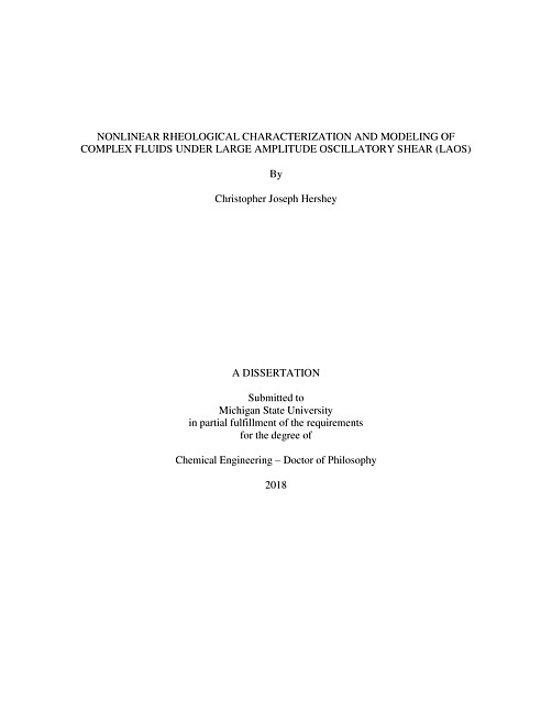 ABSTRACTNONLINEAR RHEOLOGICAL CHARACTERIZATION AND MODELING OFCOMPLEX FLUIDS UNDER LARGE AMPLITUDE OSCILLATORY SHEAR (LAOS)ByChristopher Joseph HersheyDynamic oscillatory shear tests have historically been one of the most common ways a rheologist probes the material response for complex fluid systems including neat polymer melts and solutions, blends, and composites. In small angle oscillatory shear (SAOS) testing, the material functions G' and G'' describe the linear viscoelasticity of the complex fluid and may be related to the morphological changes occurring in the system. However, typical processing conditions occur at fast flow rates and generate large deformations resulting in a strain dependence on the rheological properties. In this research, the nonlinear viscoelastic behavior of polypropylene (PP) nanocomposite melts and oligomer modified polyamide (PA) blends under large amplitude oscillatory shear (LAOS) flows was investigated using Fourier transform (FT) rheology and stress decomposition (SD) techniques. With the development of high performance data acquisition (DAQ) cards in recent years, raw voltages of angular displacement (strain) and torque (stress) from the rheometer may be Fourier transformed into discrete harmonics to probe a material’s nonlinear response. These higher order harmonics are strongly correlated to the chain dynamics and morphological changes in a polymer system.Polypropylene-clay nanocomposites were produced using concentrations of 3 and 5 wt% of silane treated nanoclay to ensure that the system was dilute, and the filler-network contribution was negligible. To promote particle-polymer interactions, the silane treated clay was reacted with a maleated polypropylene compatibilizer. The nonlinear intensity ratio I_(3/1) of the third order harmonic to the first order harmonic of the shear stress as well as the zero-strain limit nonlinearity parameter Q_0 were determined through FT rheology experiments. To describe the trends in I_(3/1) and Q_0 for polymer nanocomposite systems, a nonlinear viscoelastic differential model was developed for LAOS type flows. Blends consisting of a PA6/PA66 copolymer in an 80:20 mixture by weight were melt mixed with varying concentrations (5 and 10 wt%) and molecular weights (M_W= 750 and 1000) of an elastomeric polyisobutylene succinic anhydride (PIBSA) oligomer and tested under LAOS conditions. The low molecular weight PIBSA acts as a plasticizer on the matrix blend, reducing its shear stress with increasing concentration. The SD technique separates the elastic (σ') and viscous (σ'') contributions of the stress waveform, much like G' and G'' in SAOS flows. It was found that by increasing the concentration of PIBSA, the normally viscous response of the PA blend matrix transitioned to an elastic response. By combining SD with FT rheology, it was found that the I_(3/1) ratio were nearly identical for both PA blends with 0wt% and 5wt% PIBSA, while much larger values of I_(3/1) were identified for 10wt% PIBSA blends at lower strains.