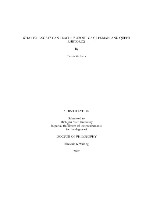 What Ex-ExGays Can Teach Us About Gay, Lesbian, and Queer Rhetorics is an interview-based research project, where I assemble a gay, lesbian, and queer (GLQ) rhetoric grounded in what I call "gay, lesbian, and queer rhetorical responsibilities"--activist rhetorical practices related to interrupting historic homophobic forces. I locate my research at the virtual site, Ex-Ex-Gays--a Facebook community made up of gay men and lesbians, myself included, who participated in but ultimately oppose the ex-gay movement. This movement centers on a western phenomenon linked to conservative organizations that claim to assist gay men and lesbians with sexual conversion through ministry and therapy. From my data, I argue that research participants (whom I call participatory theorists) tell stories meant to inform, to persuade, and to enact change within particular audience networks, share difficult perspectives based on histories of violence, employ queer narrative practices intended to disrupt and to revise grand narratives about ex-exgay activism, and use stories as a way to mediate and reclaim shame.