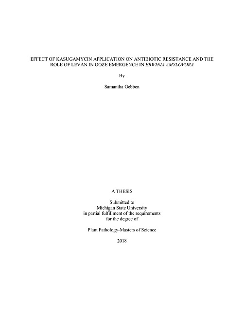 Kasugamycin (Ks) is an alternative to the use of streptomycin for the control of bacterial plant diseases. However, there is a concern that Ks application in orchards will select for Ks resistance that could be linked with other resistance genes that are active against antibiotics used in human medicine. To monitor for this, we assessed the effect of the use of Ks in orchard systems on the level of resistance to Ks and to five other antibiotics used in human medicine. Two sets of leaf and soil samples were collected (treated and non-treated with Ks) from 41 fruit tree orchards throughout the United States in 2015 and 2016. Samples were processed in the laboratory and dilution plated onto King’s B medium with or without Ks amendment. Bacterial population sizes were determined per sample and Ks-insensitive gram-negative isolates were further evaluated for multi-drug resistance. No differences were observed in Ks-insensitive populations or levels of resistance to the five other antibiotics tested between Ks treated vs. non- treated sites.Erwinia amylovora, the causal agent of fire blight of apple, is disseminated in ooze droplets, which consist of bacterial cells embedded in at least two exopolysaccharides, levan and amylovoran. Based on previous observations, we hypothesized that a reduction in levan production would result in a decrease in ooze droplets. To study this, E. amylovora strains with variation in levan production were evaluated for ooze production in growth chamber and field trials. Strains with a reduction in levan showed reduced ooze production in shoots in growth chamber studies. However, no differences in ooze production were observed in field trials.